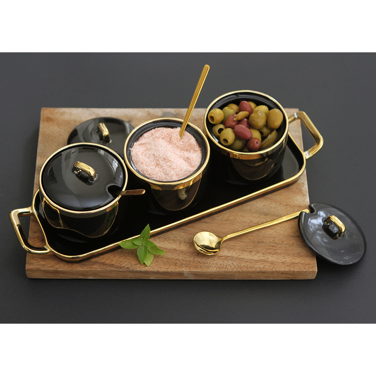 Set de 3 contenedores de cerámica de 320 ml con detalles dorados en tapas, incluye base del mismo material y cucharas metálicas. Fabricados en materiales de grado alimenticio, no aptos para microondas. Incluye caja de cartón.