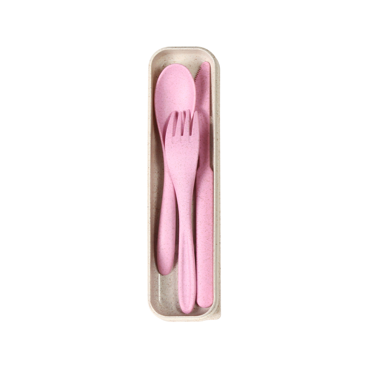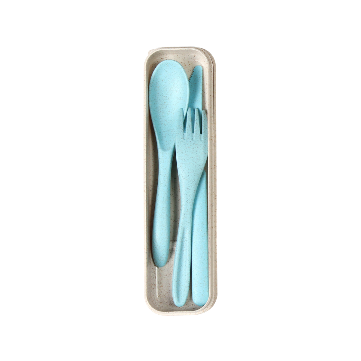 Set de cubiertos fabricados en fibra de trigo, contiene cuchara, tenedor y cuchillo. Incluye estuche del mismo material.