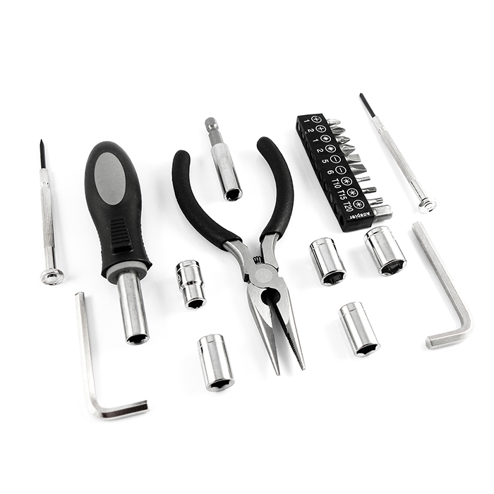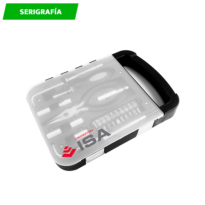 Set de herramientas en estuche de plástico con asa y 22 piezas: Pinzas, 2 desarmadores, 10 puntas intercambiables, adaptador para puntas, 5 dados, 2 llaves allen y mango para dados.