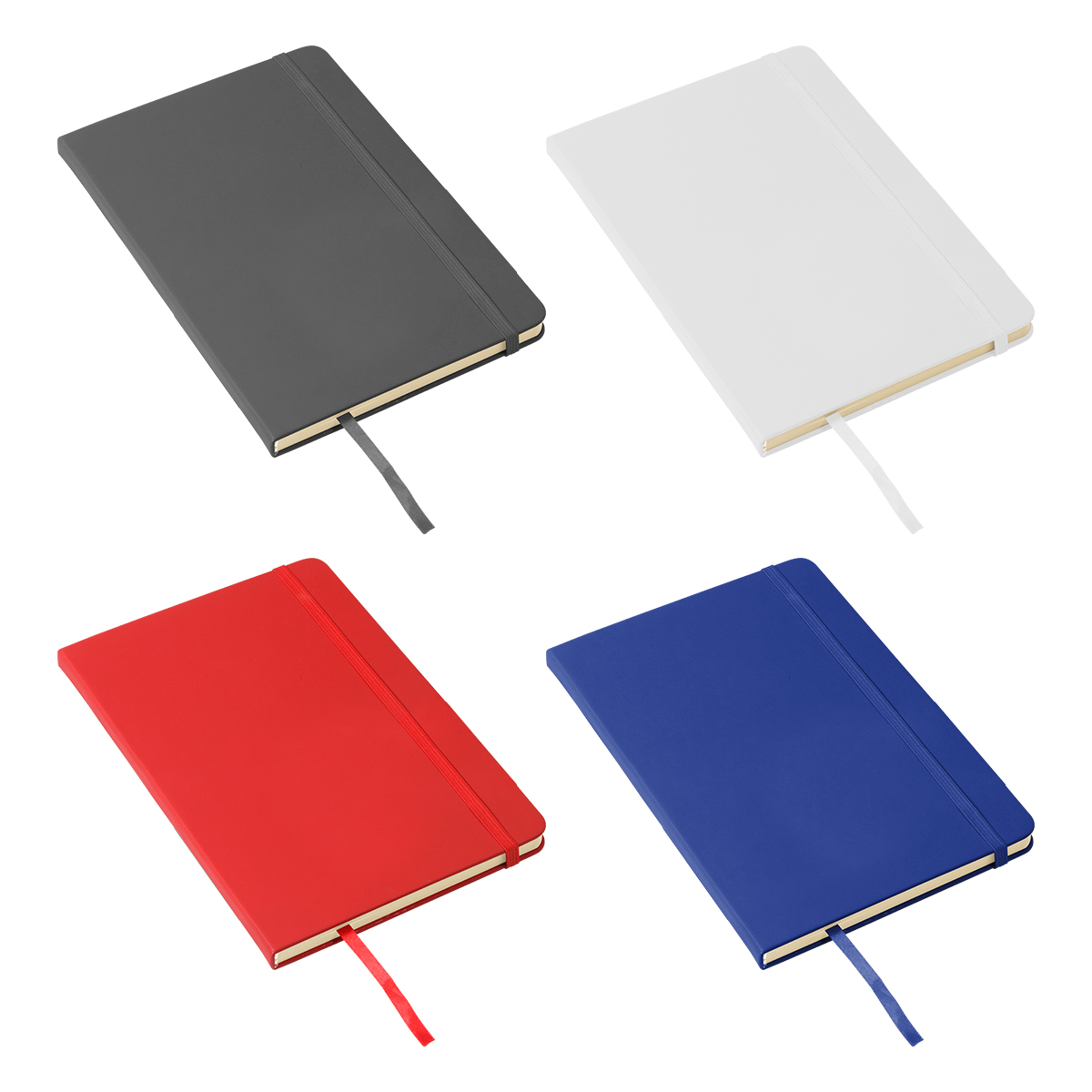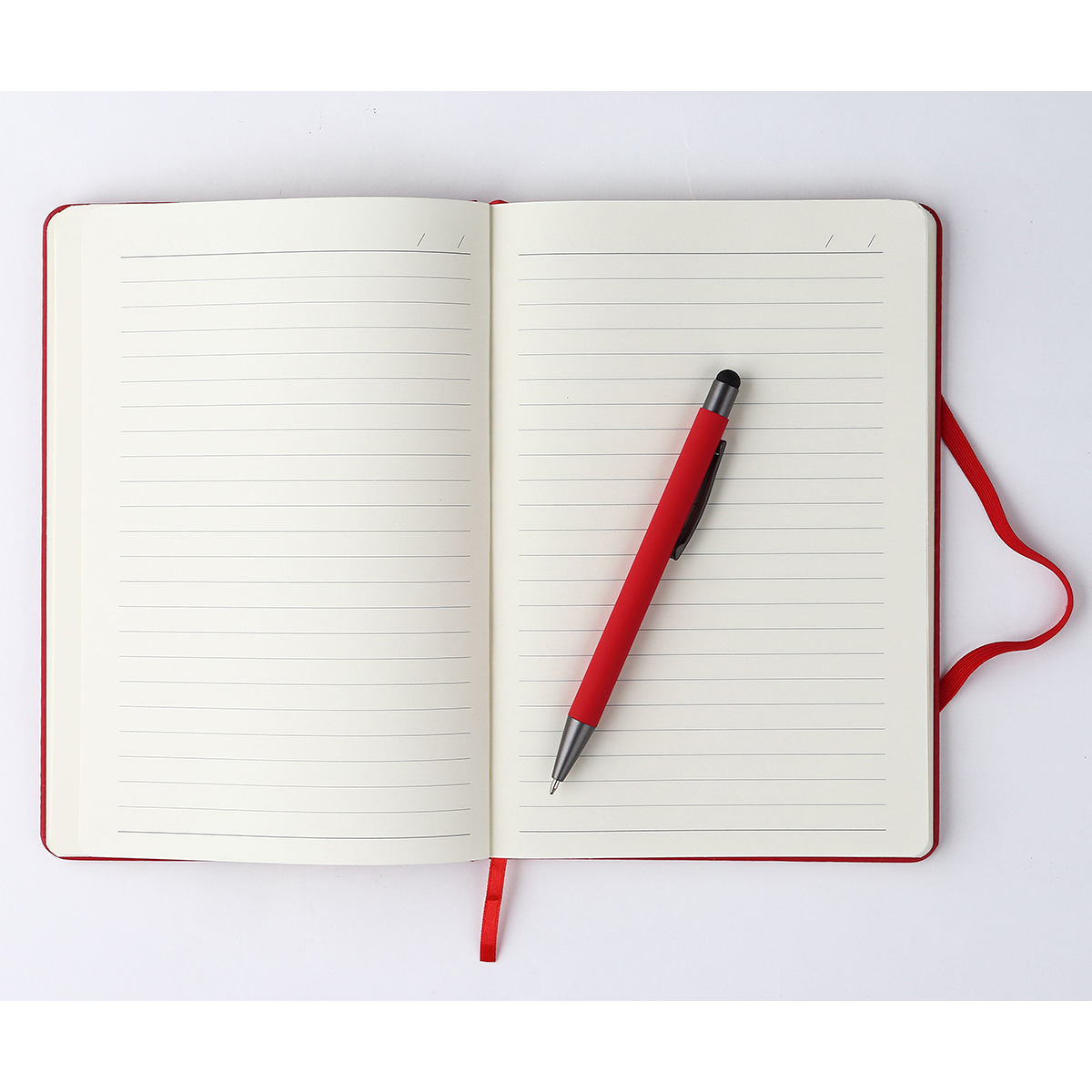 Set de libreta con pasta rígida de PU, 80 hojas rayadas de 70 g, separador de hojas y banda elástica; incluye manga negra removible.Bolígrafo con barril de aluminio acabado tipo Rubber, touch en la parte superior y tinta de escritura color negro.incluye estuche de cartón individual. Tamaño A5.