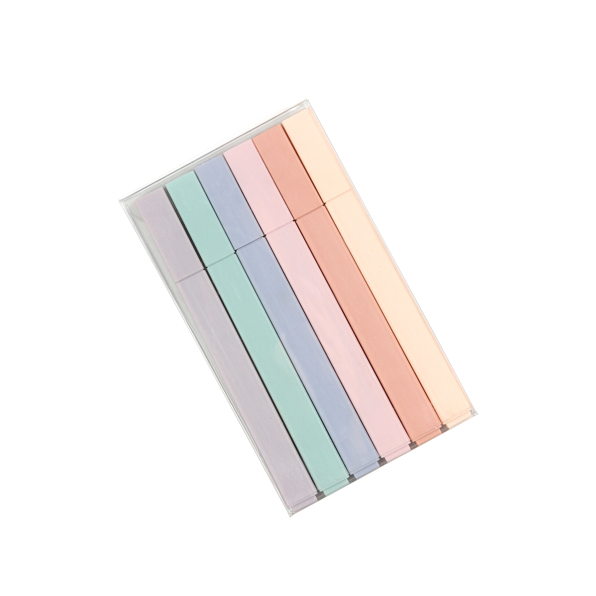 Set de 6 marcadores de texto en tonalidades pastel con cuerpo cuadrado. El set incluye colores en Azul, Morado, Naranja, Rosa, Rojo y Verde. Tinta del mismo color que el cuerpo del marcador. Ideales para la oficina o el colegio.