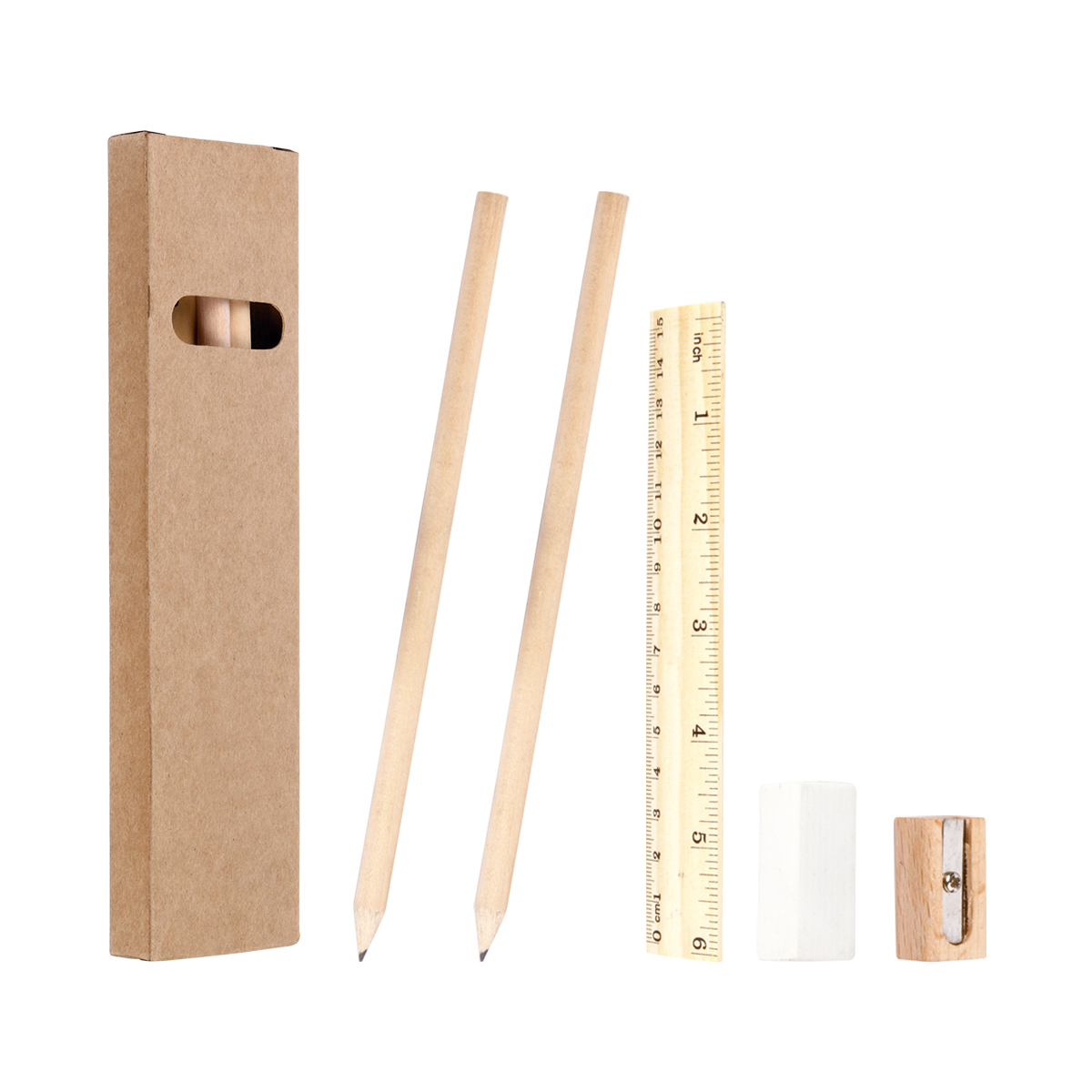 Set escolar ecológico con goma, 2 lápices, regla de madera con 15 cm y sacapuntas de madera.