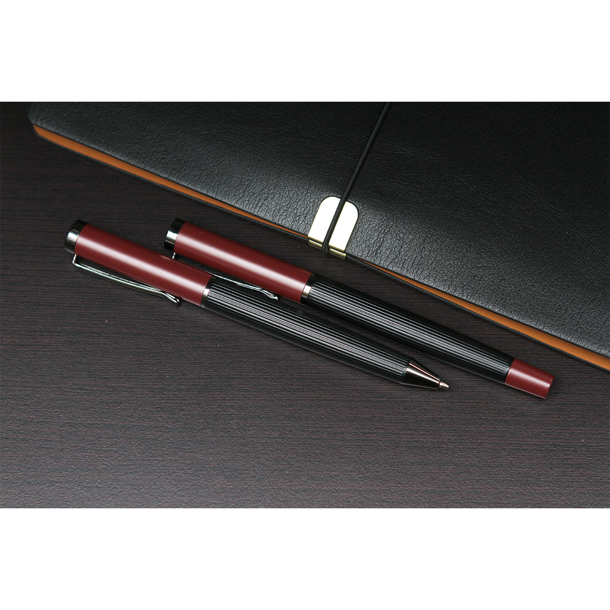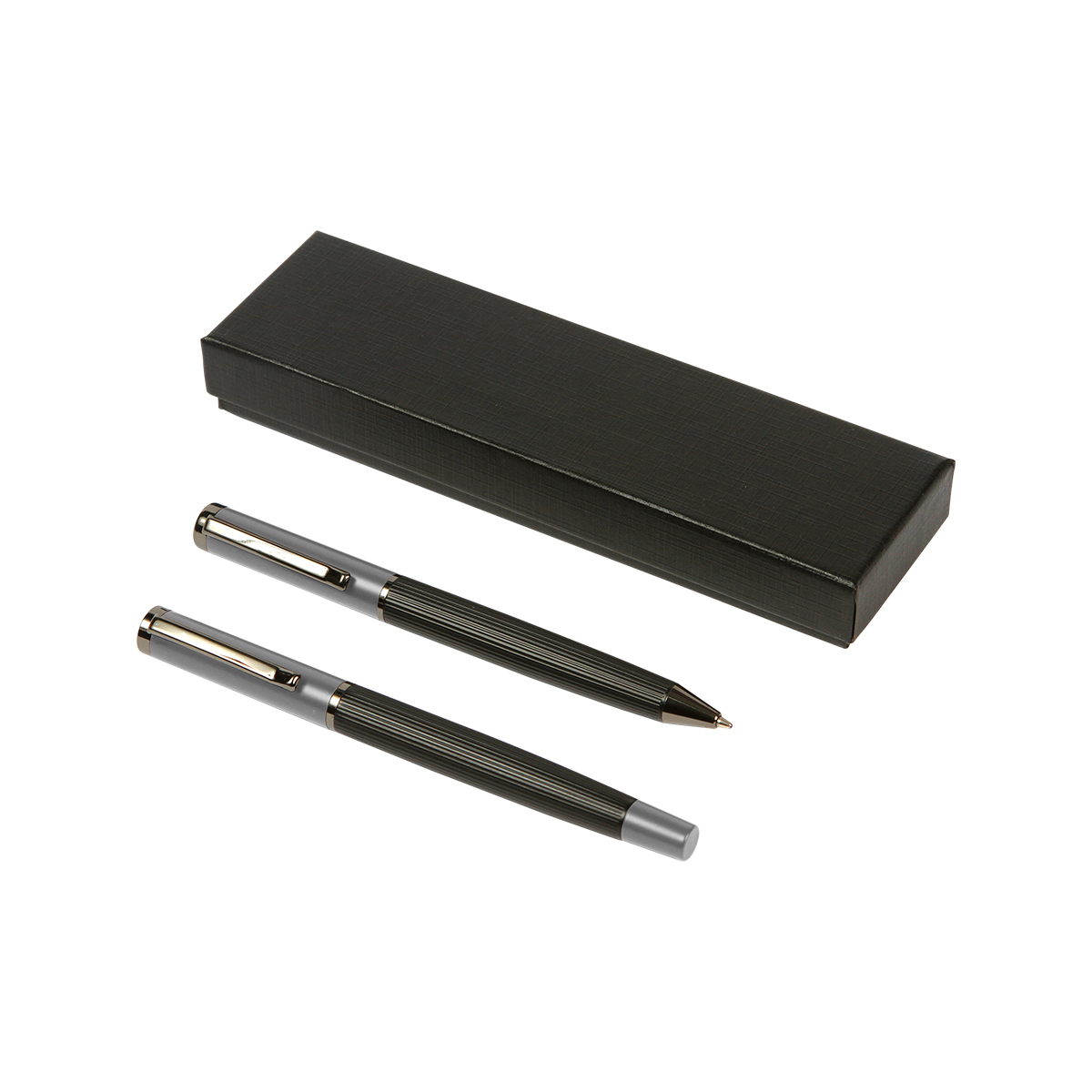 Set de bolígrafos con barril fabricado en acero inoxidable, con detalles en color plateado, uno de ellos tipo roller pen con tinta en gel y el otro tipo ball pen con tinta normal. Tinta de escritura color negro. Incluye caja de regalo color negro.