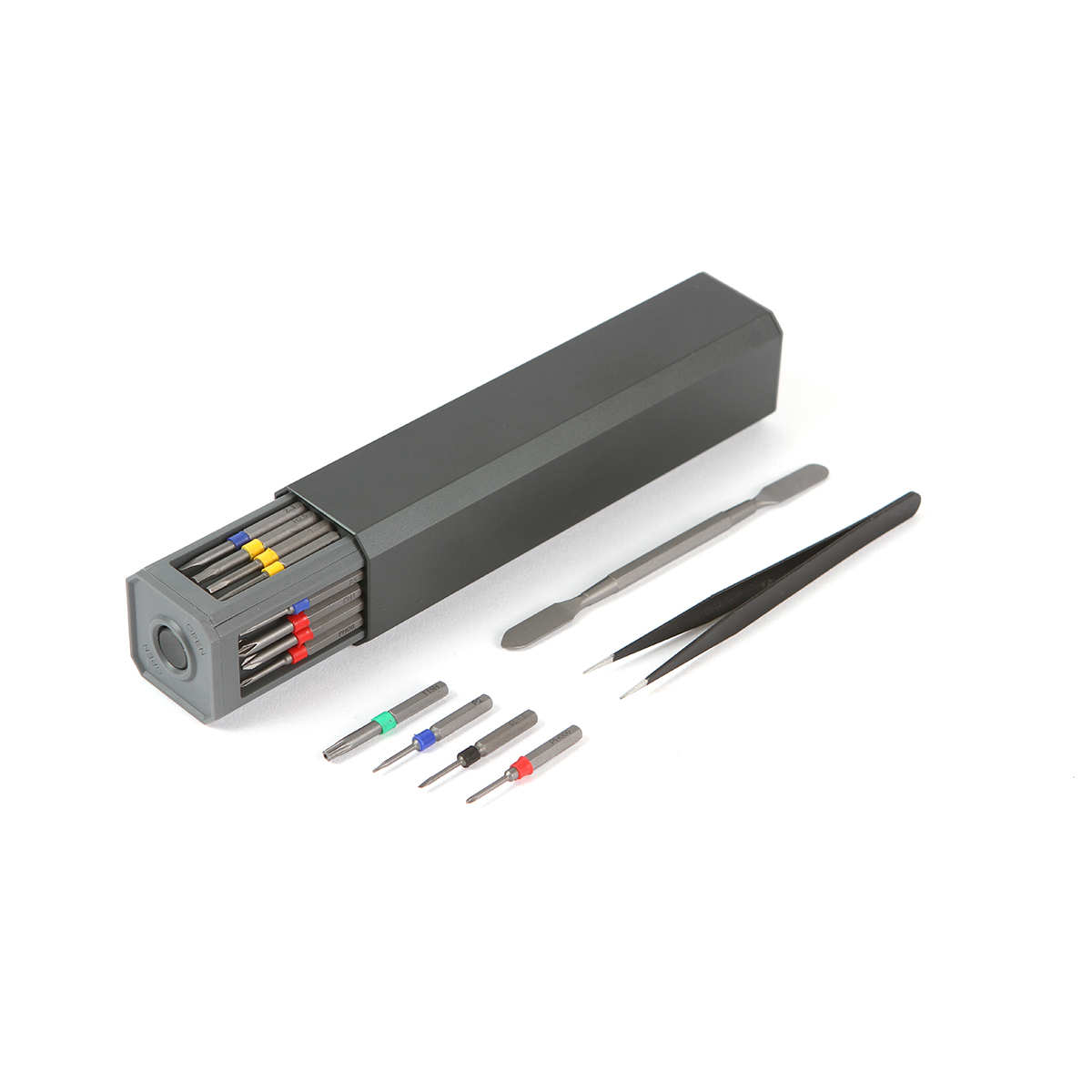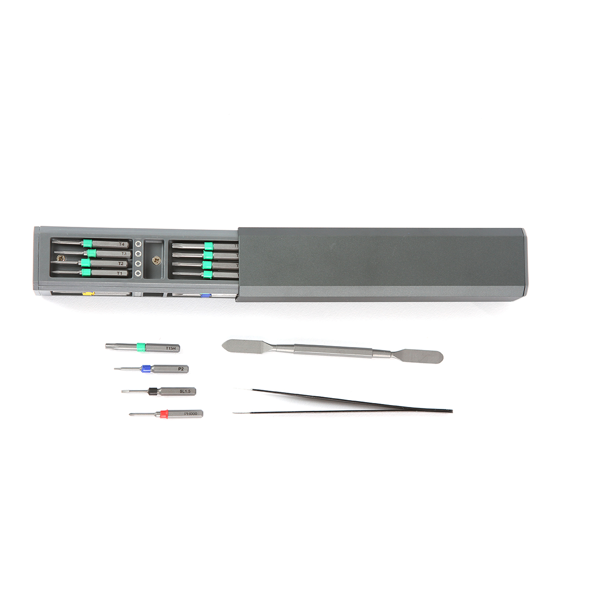 Set de destornilladores fabricado en aluminio, plástico ABS, con herramientas fabricadas en acero #45. Este set contiene 30 piezas en total, distribuidas de la siguiente manera: destornillador modelo PH000, PH00, PH0, PH1, SL1.5, SL1.7, SL2.5, SL3.0, T1, T2, T3, T4, T5, H1.5, H2.0, H2.5, T6H, T8H, T10H, T15H, T20H.