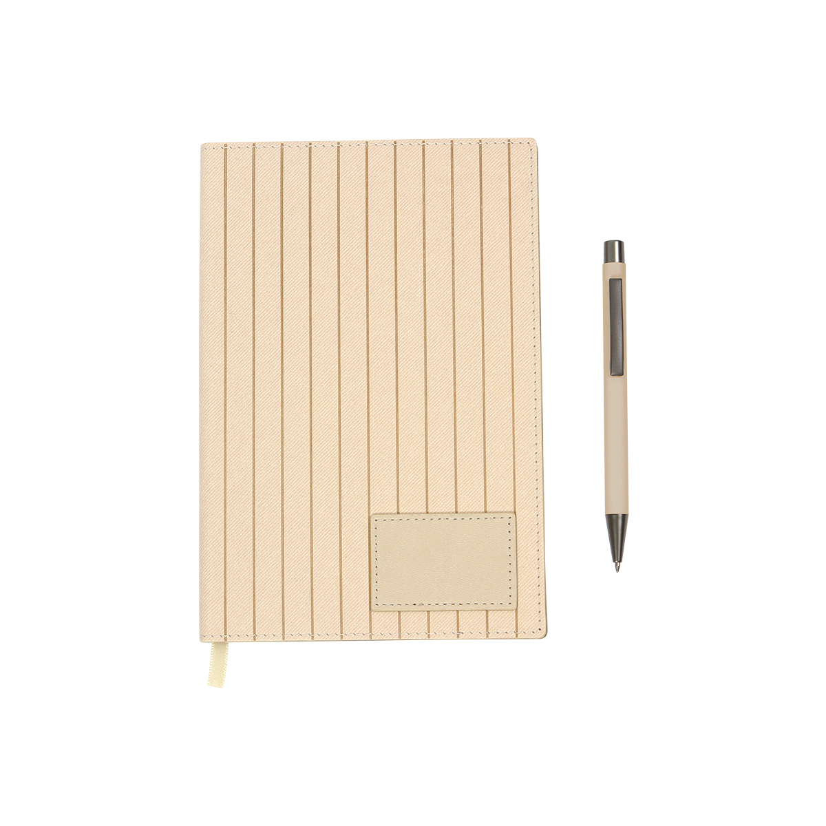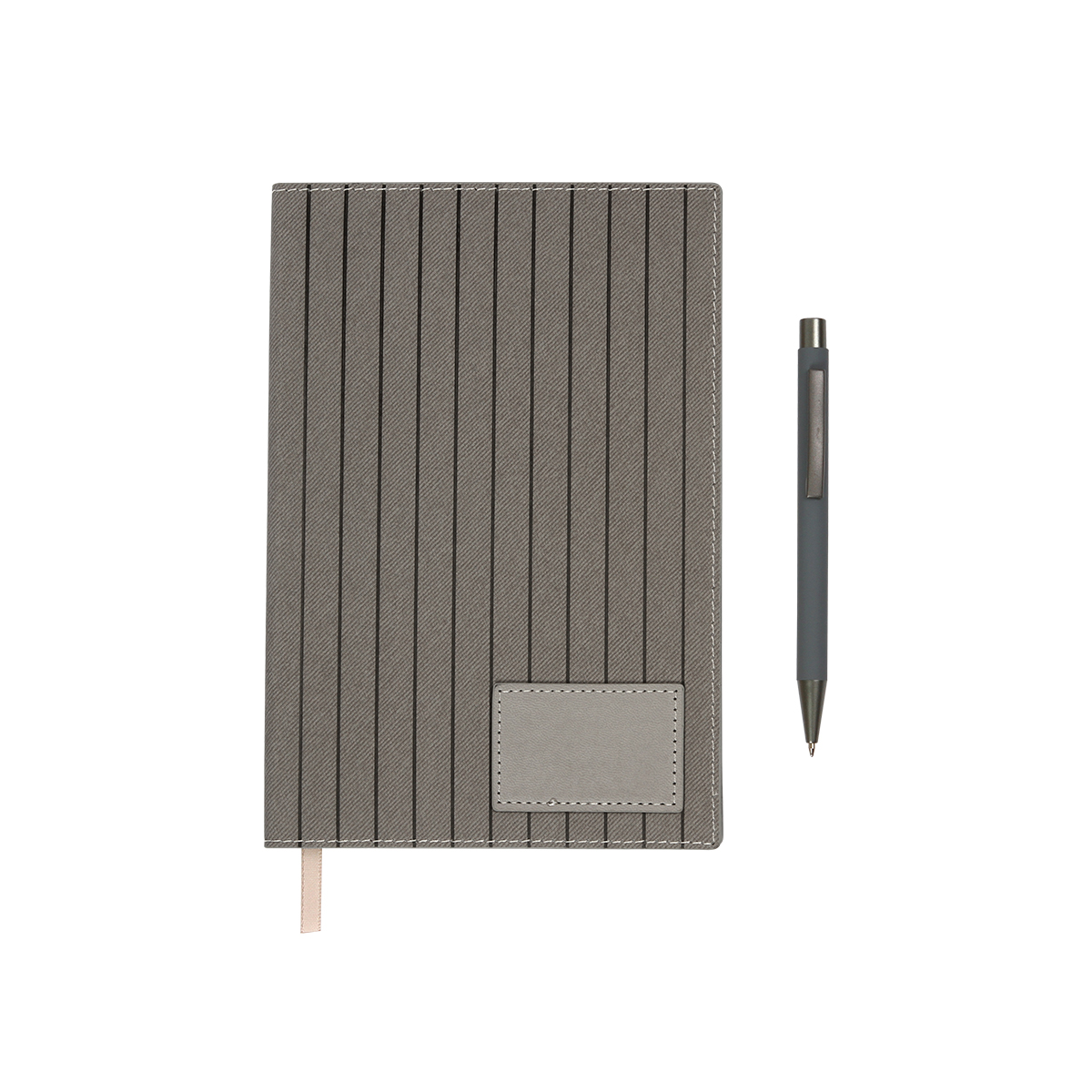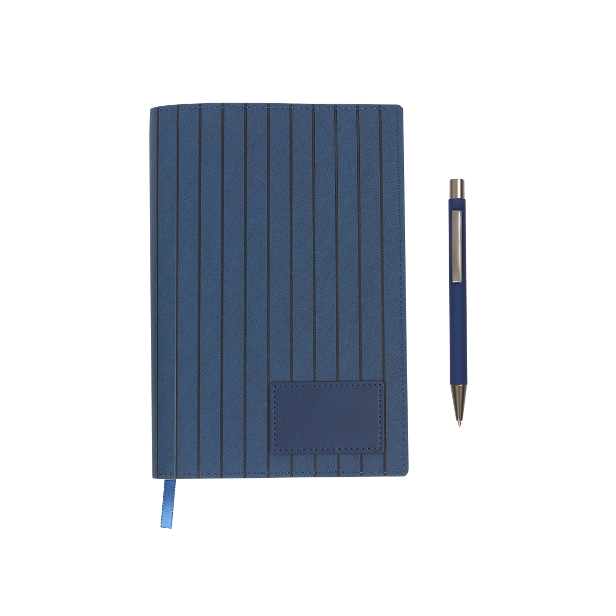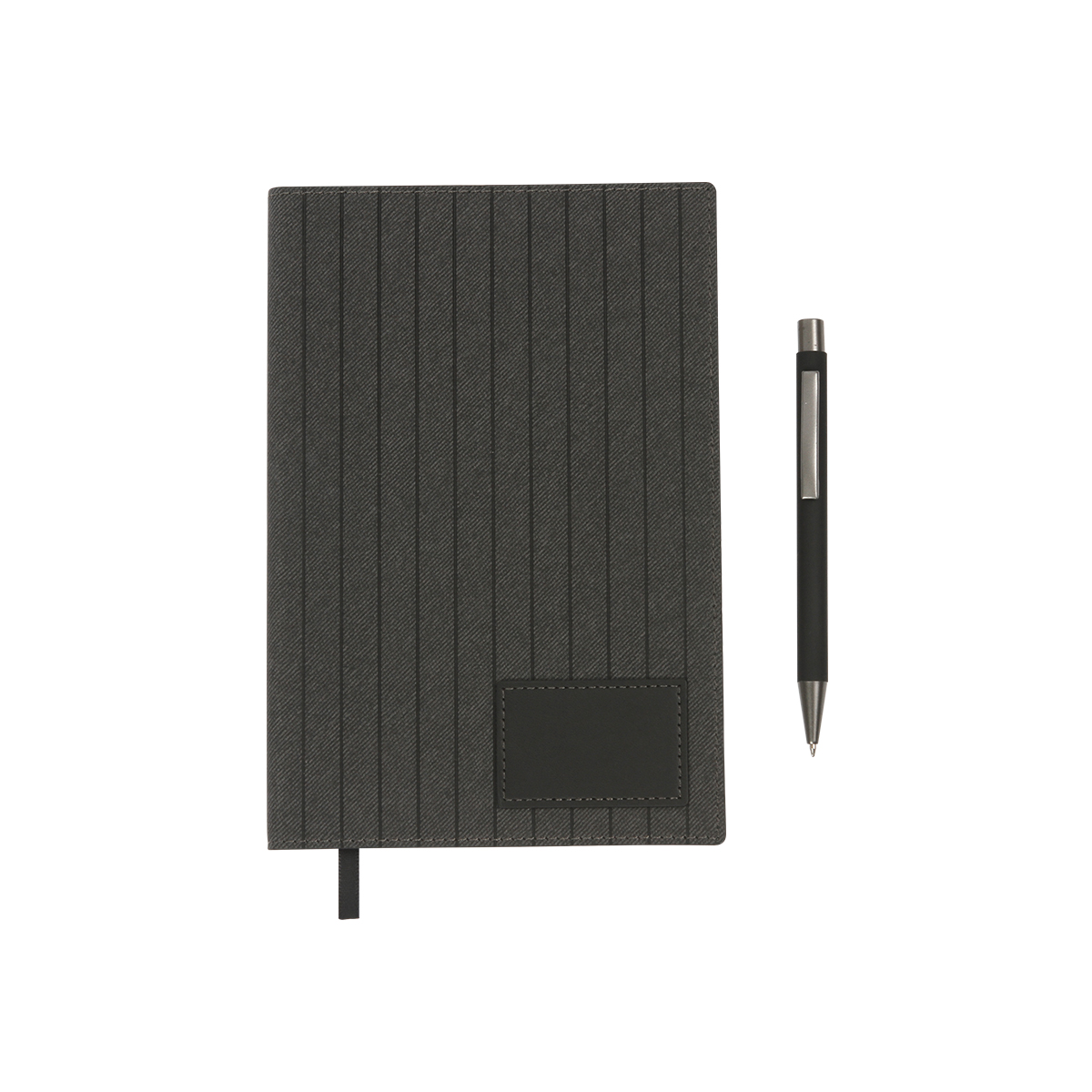 Set ejecutivo, incluye bolígrafo y libreta tamaño A5 con cubierta fabricada en PU (curpiel) con una etiqueta rectangular cosida en la esquina inferior derecha. Interior 135 hojas blancas de 80g. Incluye caja de regalo color negro.