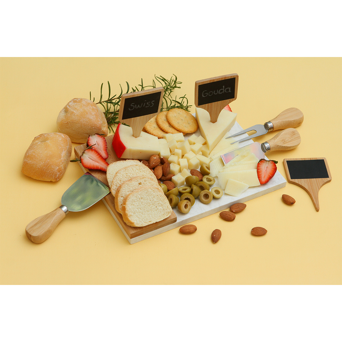 Set de quesos fabricado en mármol y madera de bambú. Incluye 3 marcadores y 3 cuchillos de acero inoxidable, especiales para quesos. Su diseño en mármol le otorga un perfil elegante, que lo hace la opción indicada para reuniones.