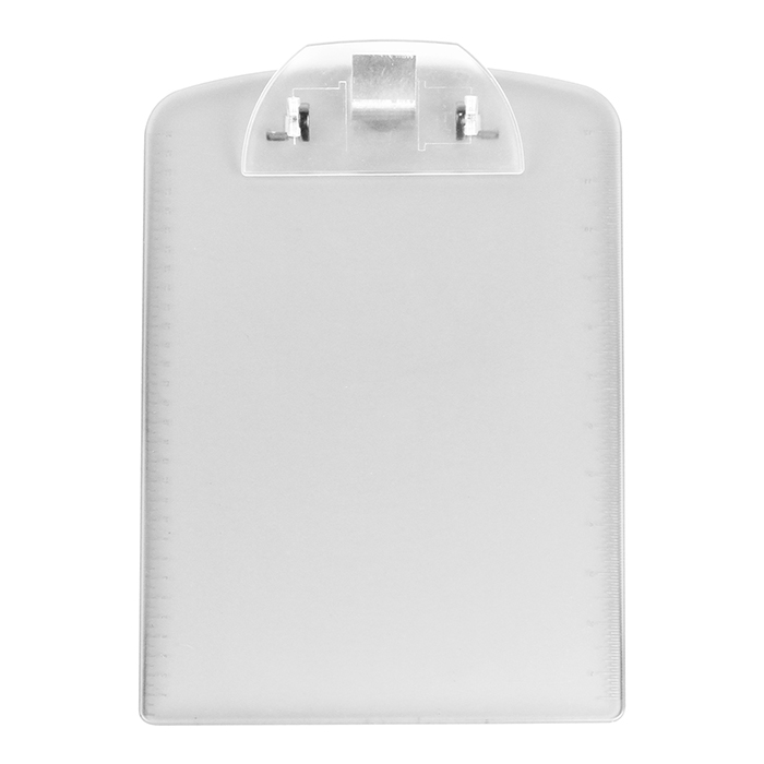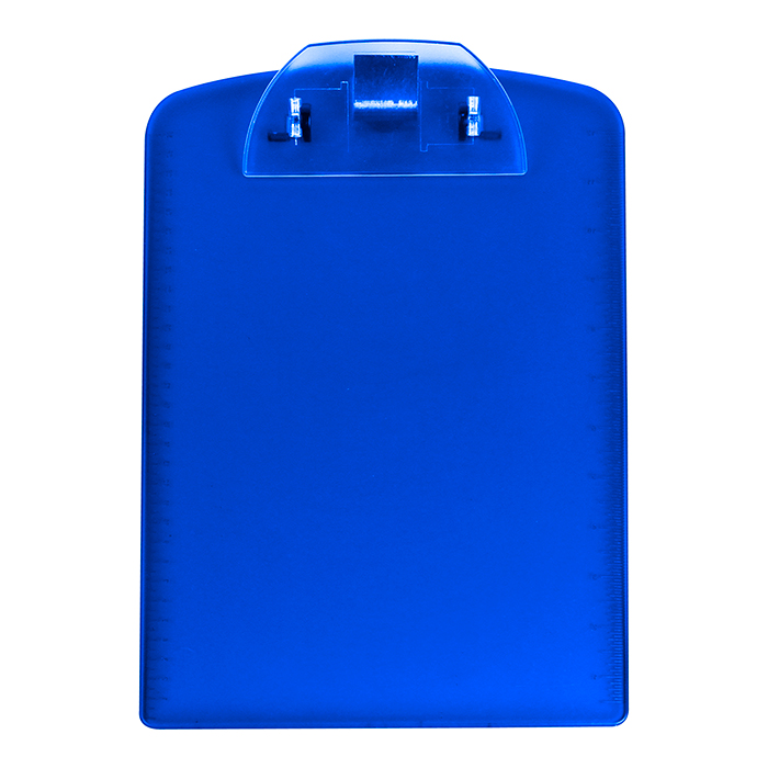 Tabla de plástico translucido con clip para documentos y regla en las orillas. No incluye pluma.