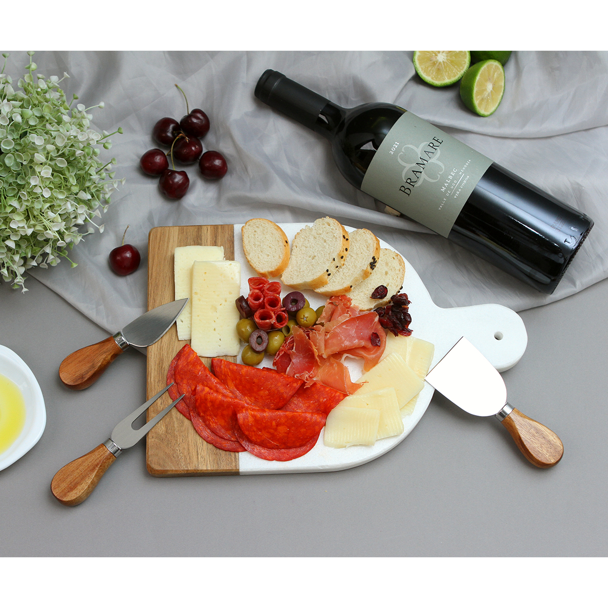 Tabla para quesos fabricada en mármol blanco y madera de acacia con acabado en laca para una mayor resistencia, incluye 1 cuchillo, 1 trinche y 1 espátula, fabricados en madera de acacia y acero inoxidable.