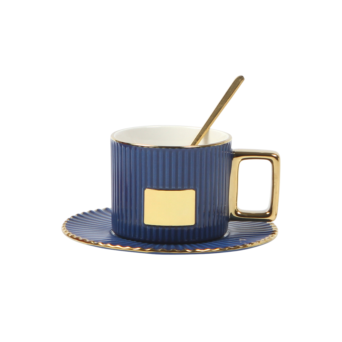 Taza de cerámica de 260 ml con detalles dorados en asa y placa metálica. Incluye plato fabricado en el mismo material y cuchara metálica, fabricados en materiales de grado alimenticio, no aptos para microondas. Incluye caja de cartón.