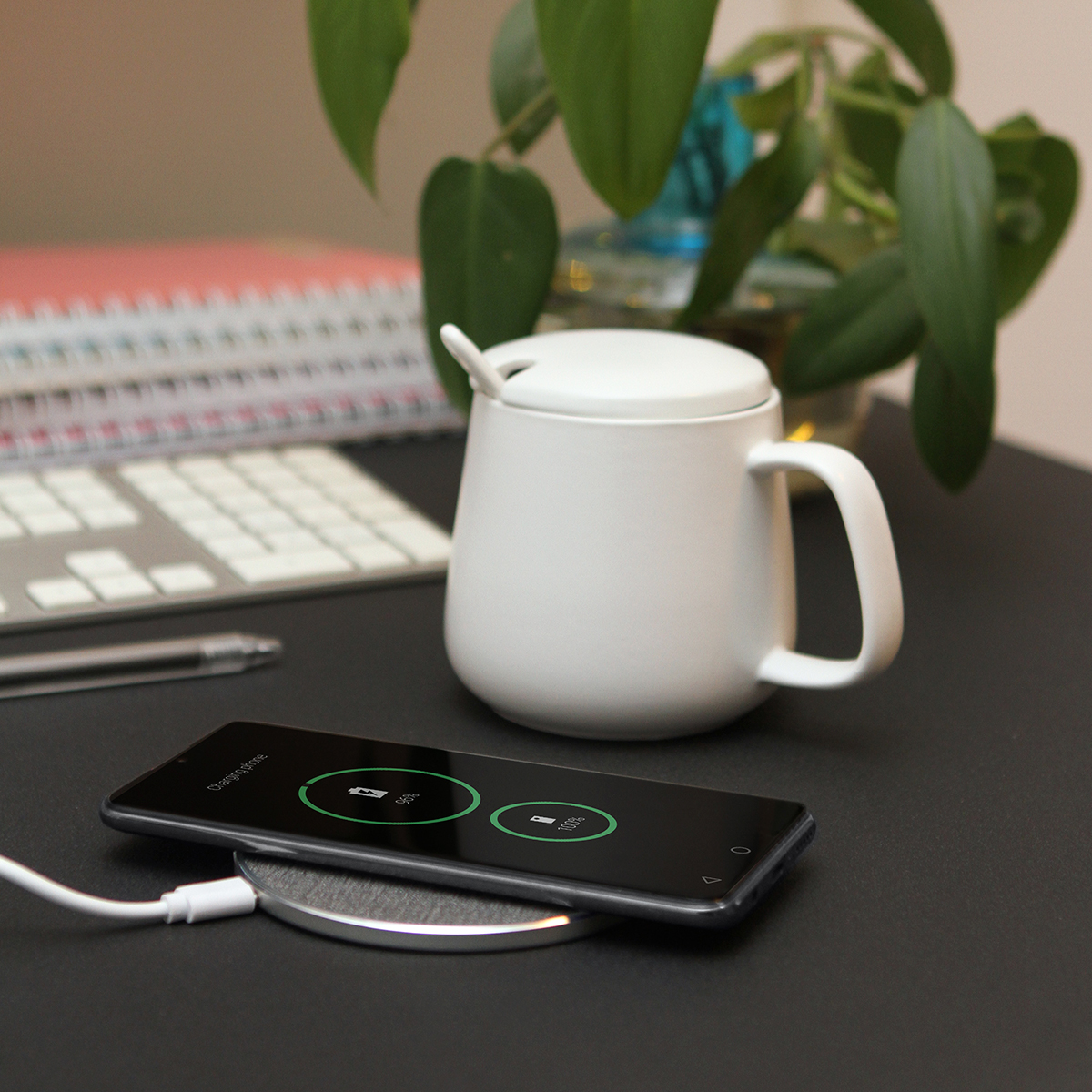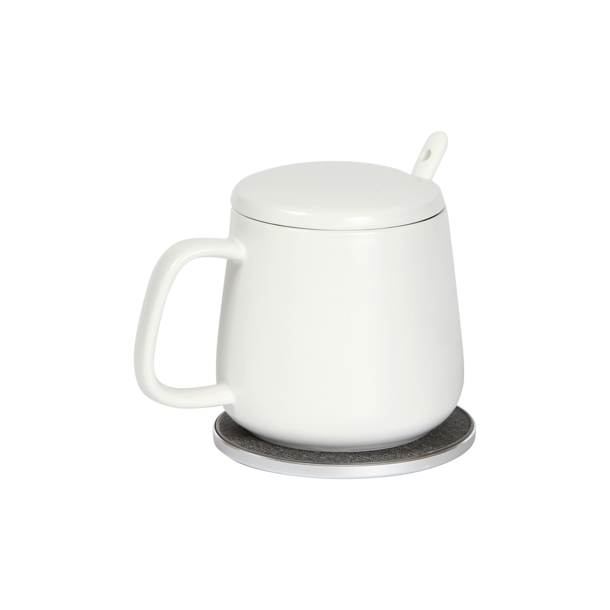 Taza de cerámica de 350 ml con calentador y cargador inalámbrico integrado de 10W (wireless para celular). Especialmente diseñada para mantener la temperatura de la bebida, con tapa y cuchara a juego. Incluye cargador de pared y cable de carga Tipo C. Incluye caja de cartón individual.