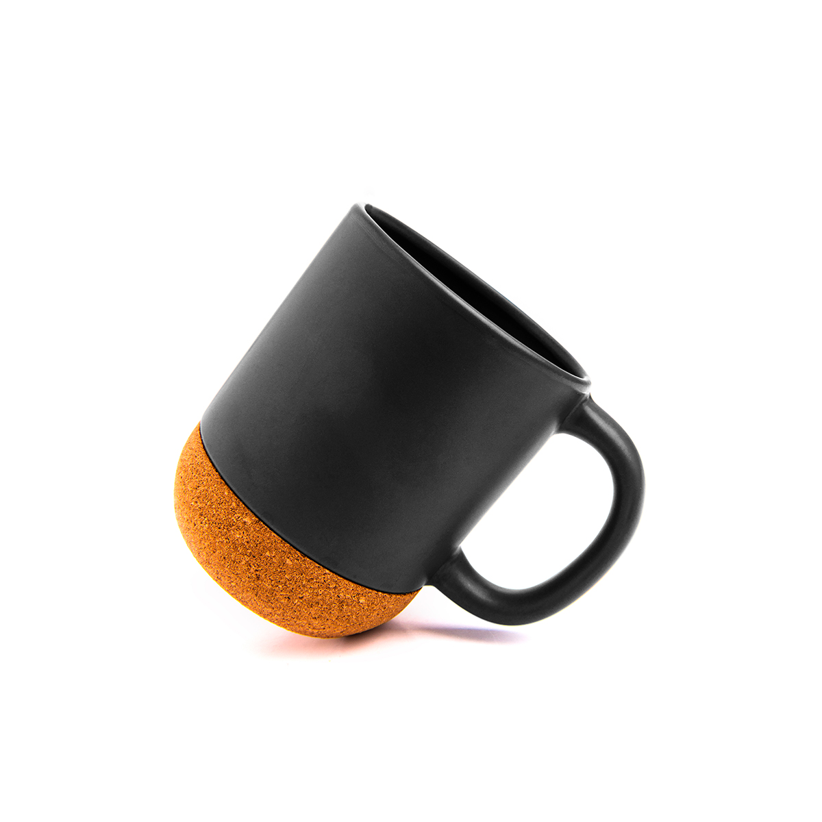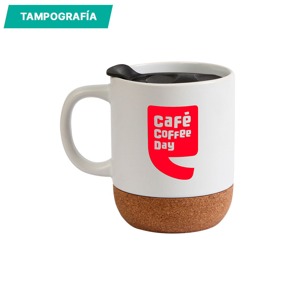 Taza de cerámica con base de corcho aislado extraíble y tapa deslizable de PP (polipropileno). Ideal para té o café. Capacidad 400 ml. Incluye caja de cartón individual.