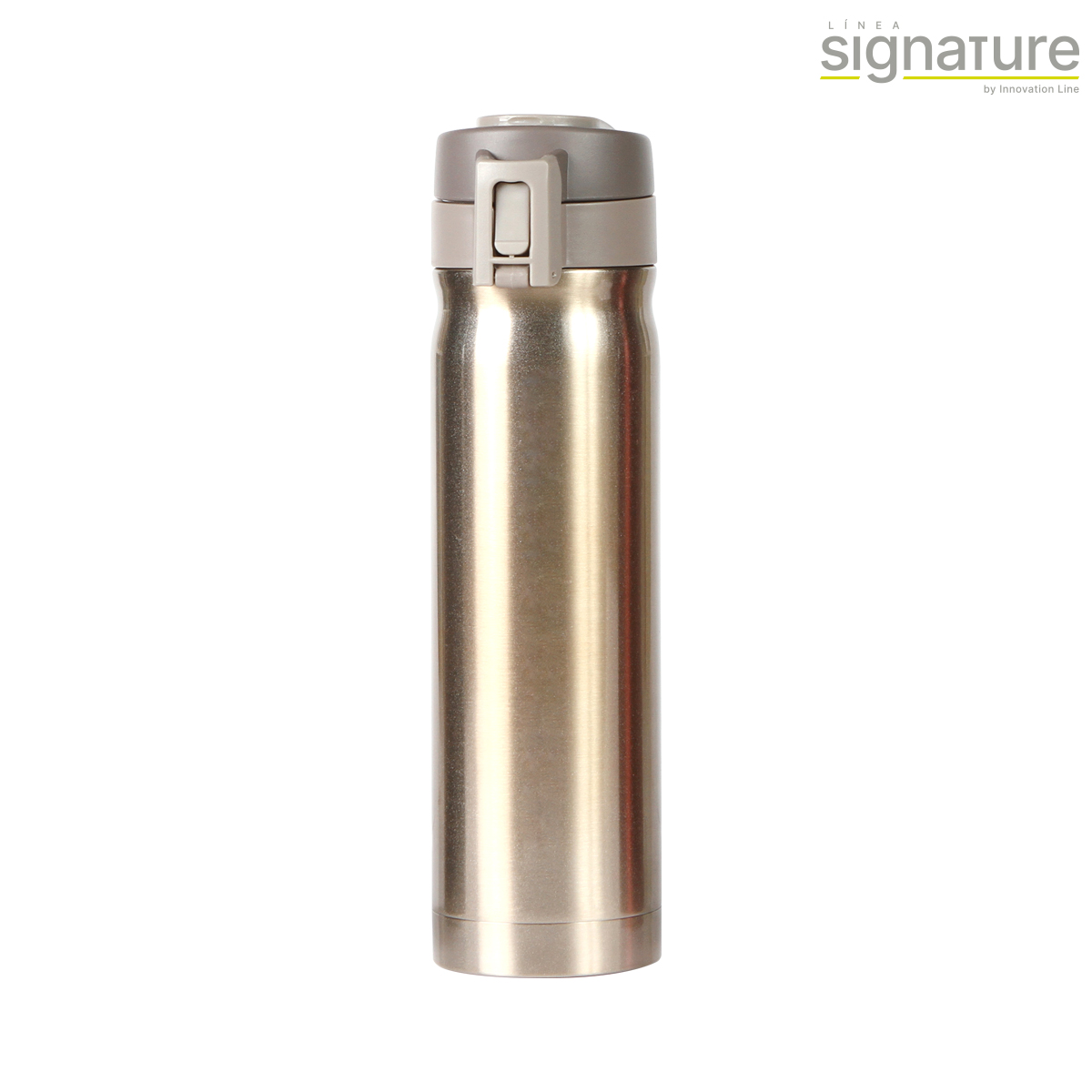 Termo de acero inoxidable doble pared con tapa con seguro, fabricado en materiales de grado alimenticio, mantiene bebidas frías o calientes por un largo tiempo, no usar en microondas. Capacidad de 500 ml (17 oz). Incluye caja de cartón individual.