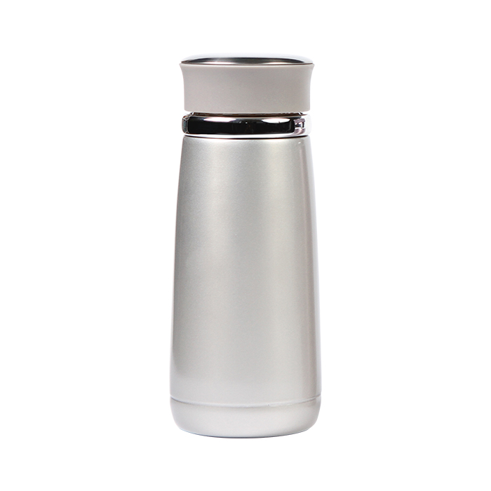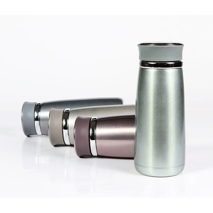 Termo de acero inoxidable doble pared con acabado brillante y detalles metálicos, fabricado en materiales de grado alimenticio, mantiene bebidas frías o calientes por un largo tiempo, no usar en microondas. Capacidad de 420 ml (14 oz). Incluye caja de cartón individual.