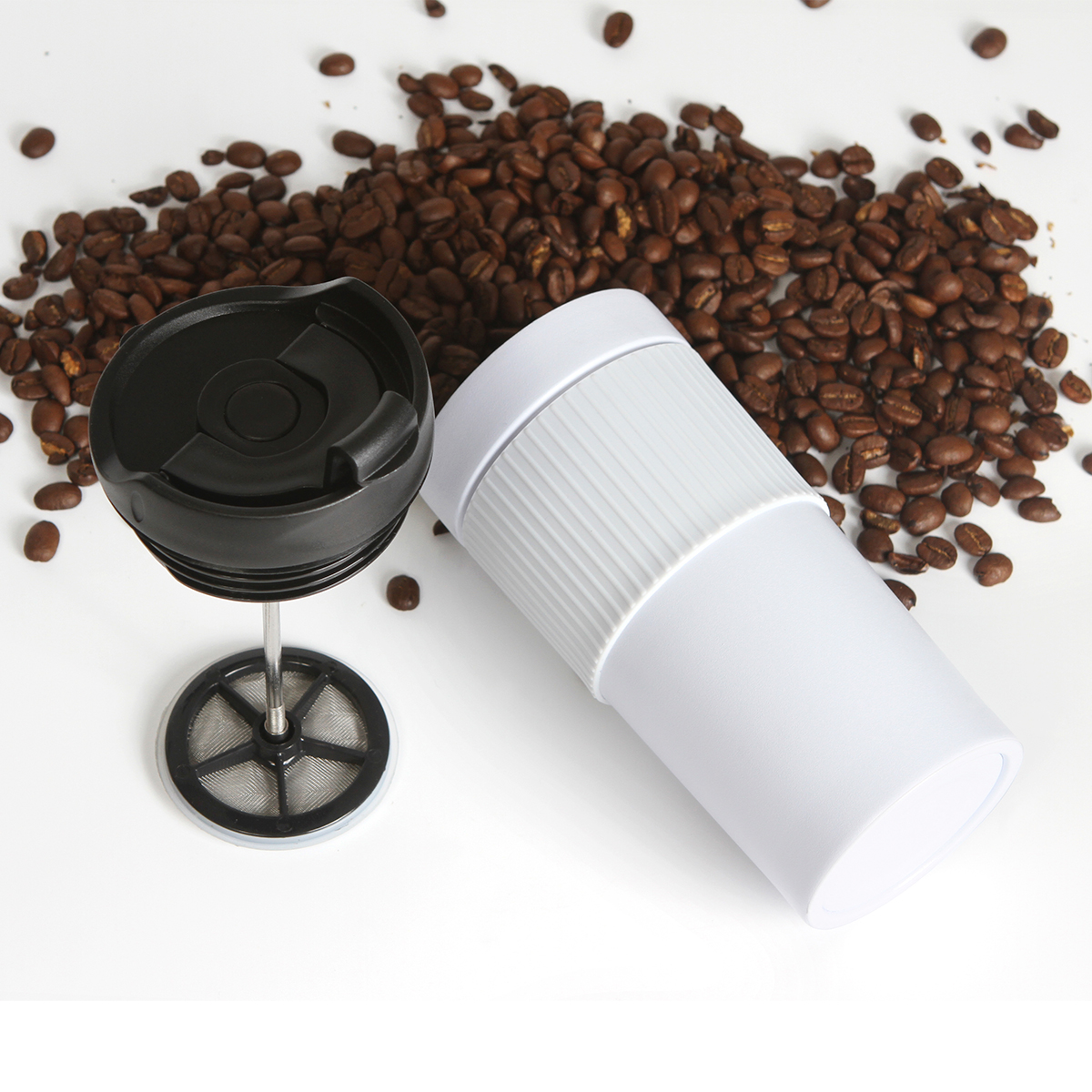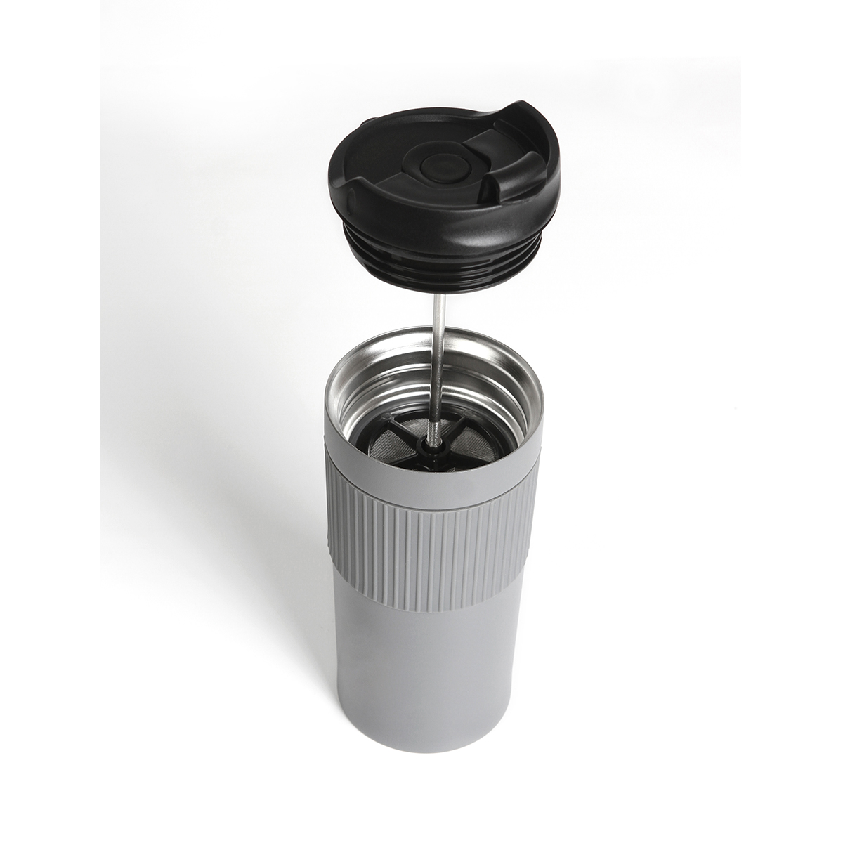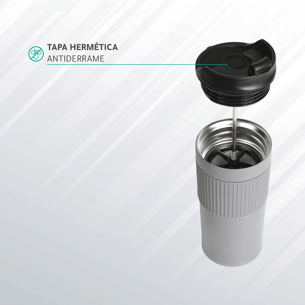 Termo de doble pared de acero inoxidable con manga de silicon, prensa francesa de acero inoxidable, tapa hermética anti derrame con cubierta de seguridad, fabricado en materiales de grado alimenticio, mantiene bebidas calientes por un largo tiempo, no usar en microondas. Capacidad de 480 ml. Incluye caja de cartón individual.
