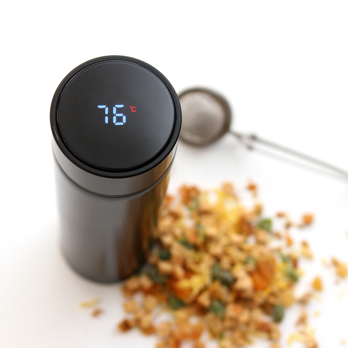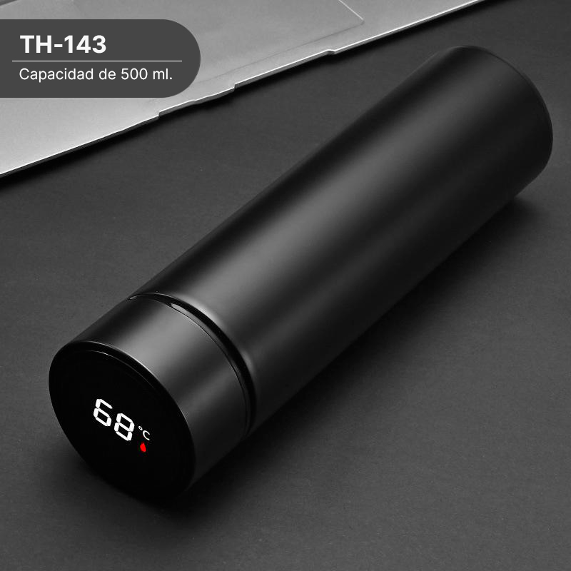 Termo inteligente de acero inoxidable doble pared; con pantalla LED indicadora de temperatura interior en la tapa. Fabricado en materiales de grado alimenticio, mantiene bebidas frías o calientes por un largo tiempo. La batería dura hasta 2 años. No usar en microondas. Capacidad de 500 ml. Incluye caja de cartón individual.