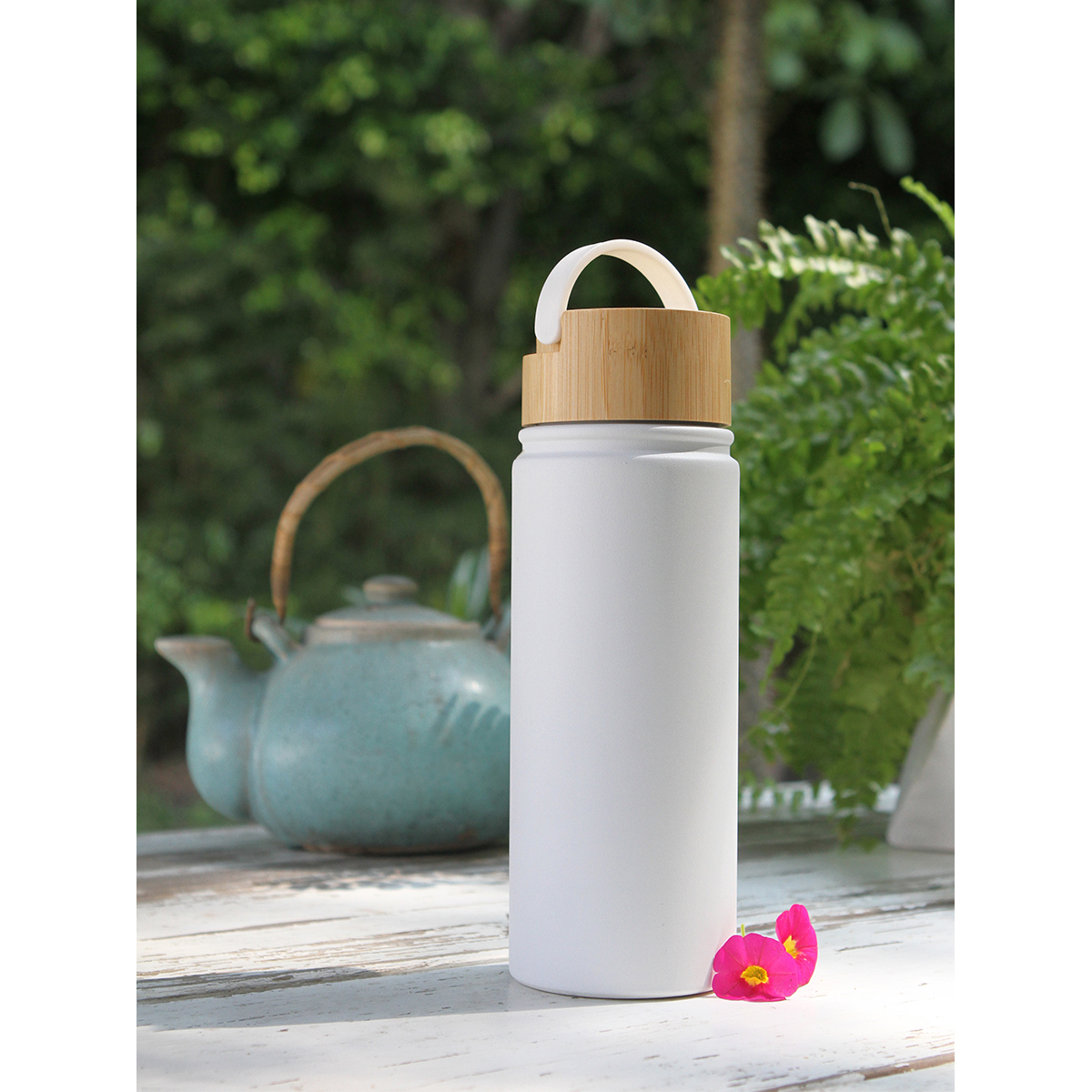 Termo de acero inoxidable doble pared con tapa de bambú y plástico. Fabricado en materiales de grado alimenticio, mantiene bebidas frías o calientes por un largo tiempo. No usar en microondas. Capacidad de 500 ml. Incluye caja de cartón individual.