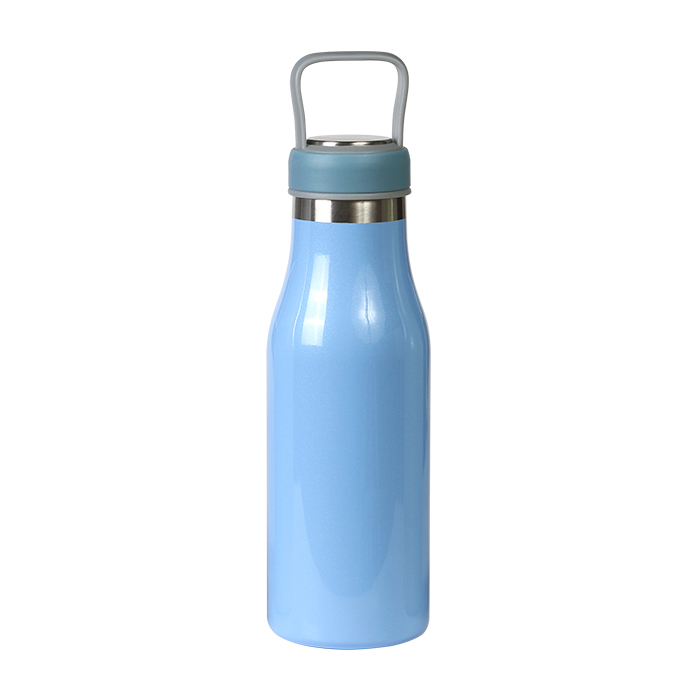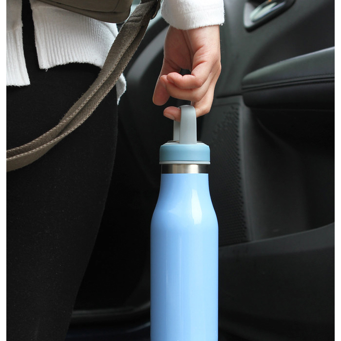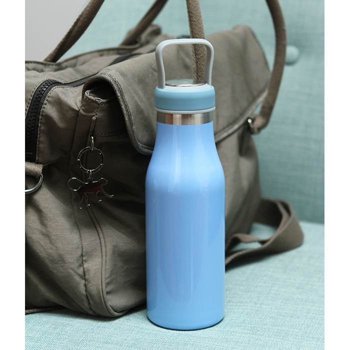 Termo de acero inoxidable doble pared con asa de plástico y detalles metálicos, fabricado en materiales de grado alimenticio, mantiene bebidas frías o calientes por un largo tiempo, no usar en microondas. Capacidad de 510 ml (17 oz). Incluye caja de cartón individual.