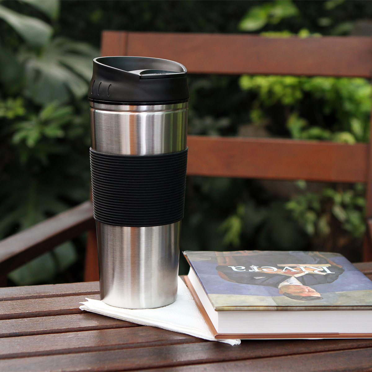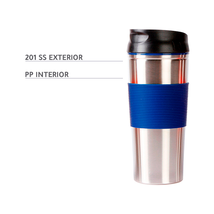 Termo de acero inoxidable con manga de silicón y tapa deslizable, fabricado en materiales de grado alimenticio, no usar en microondas. Capacidad 500 ml (17oz).