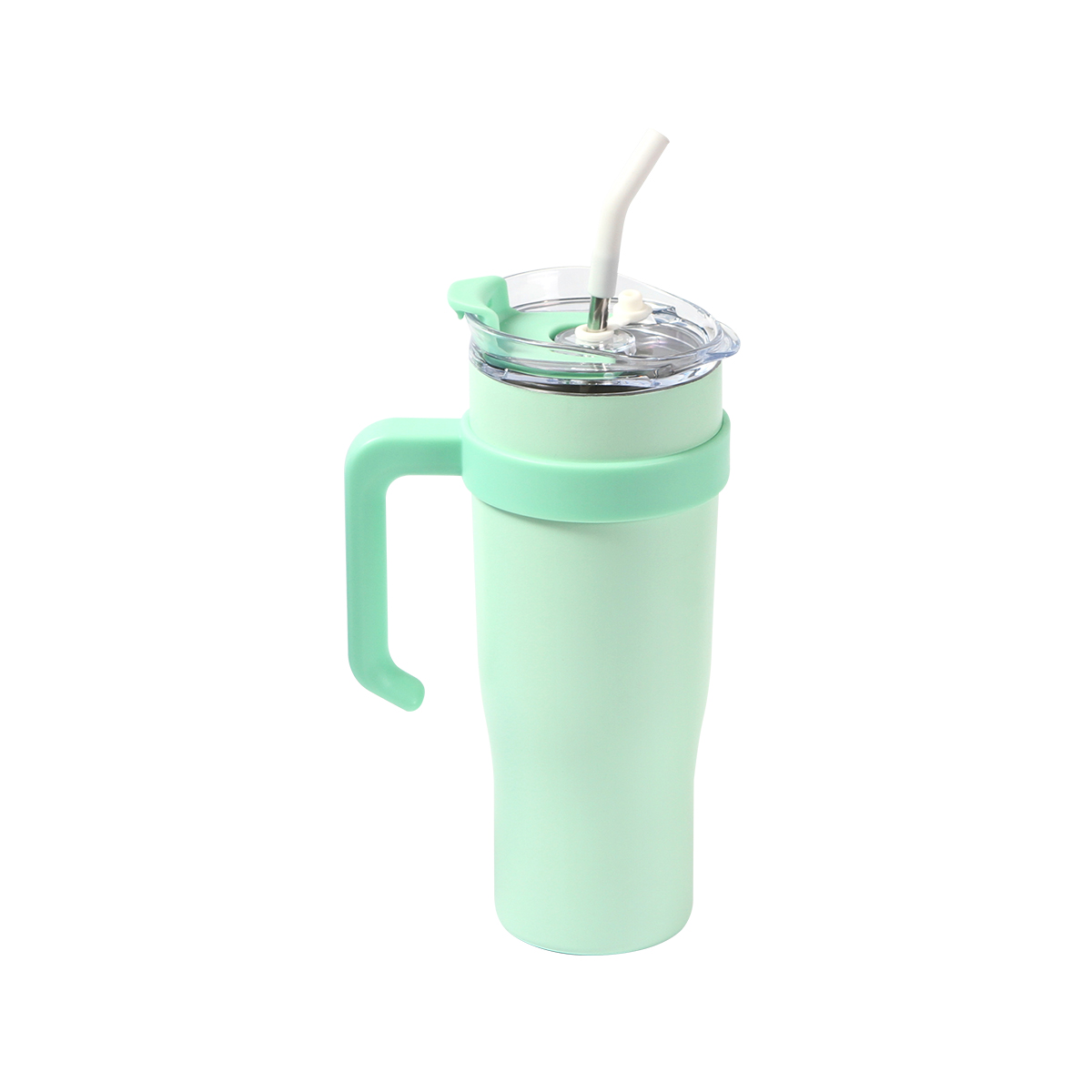 Termo doble pared fabricado en acero inoxidable SS304 y SS201, con capacidad de 1,200 ml. Empaquetado con bolsa y caja. Incluye asa y popote.