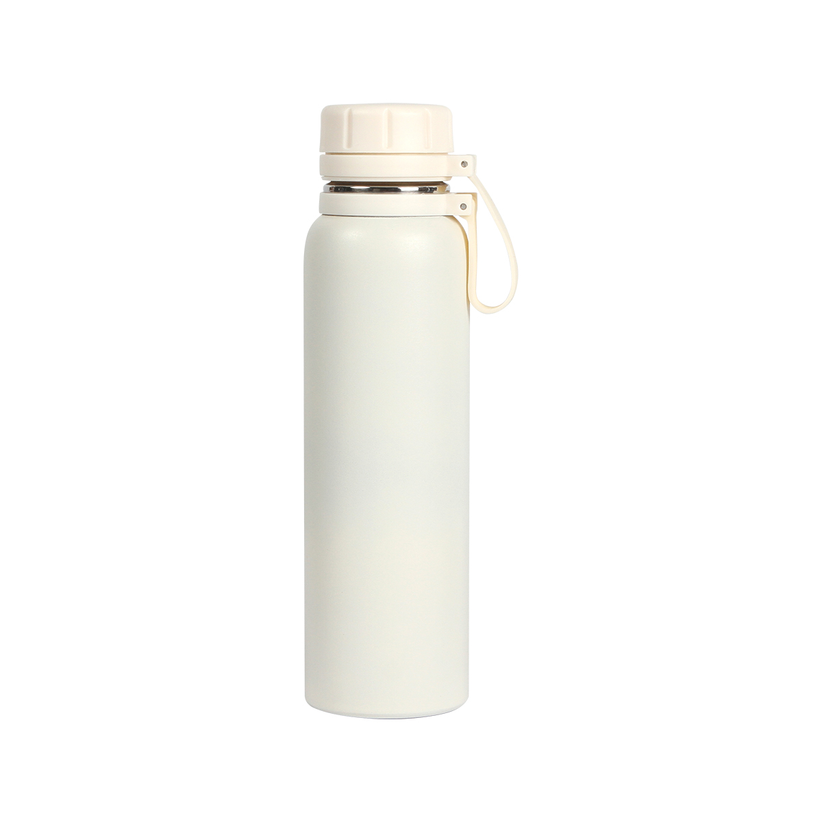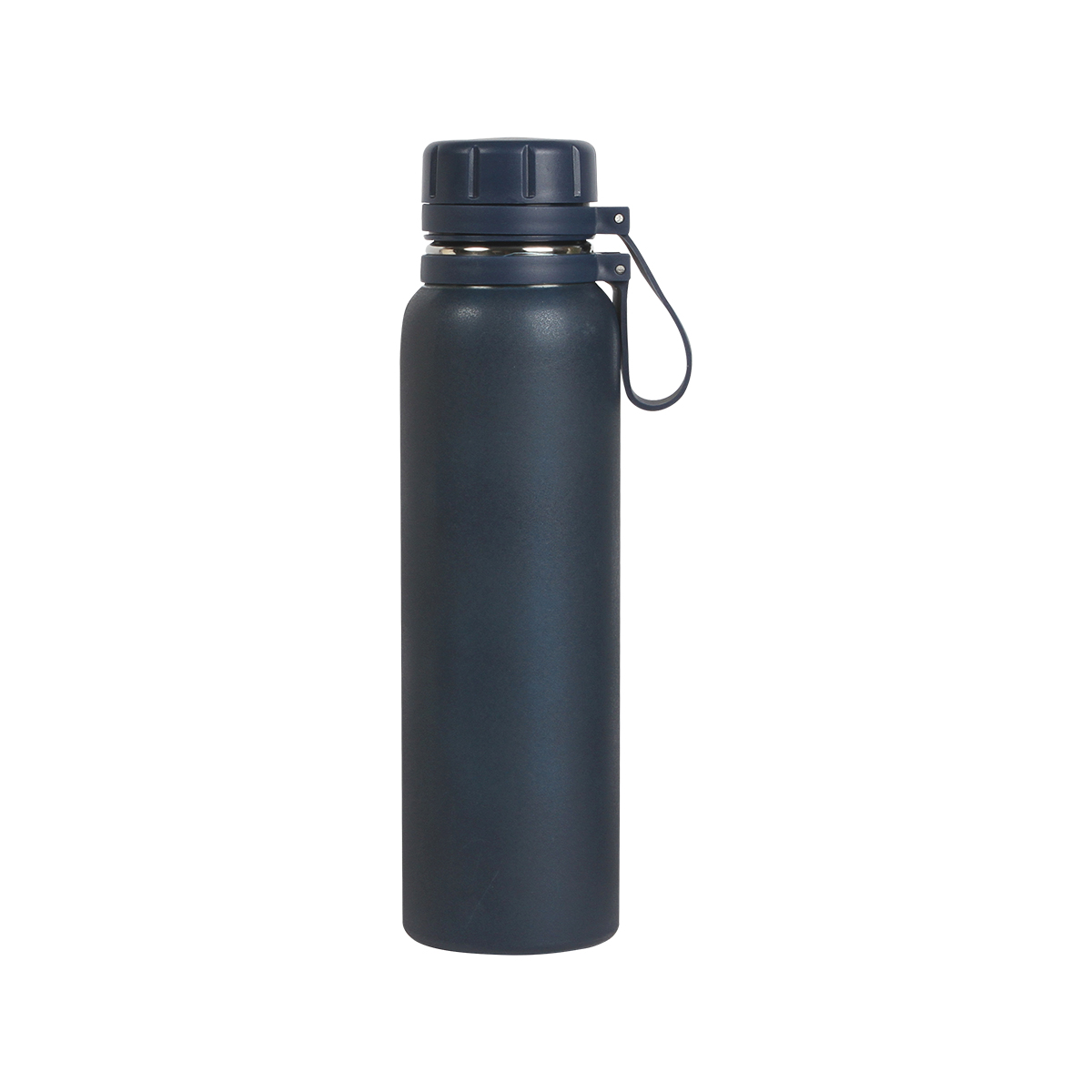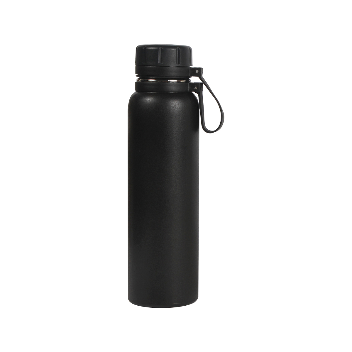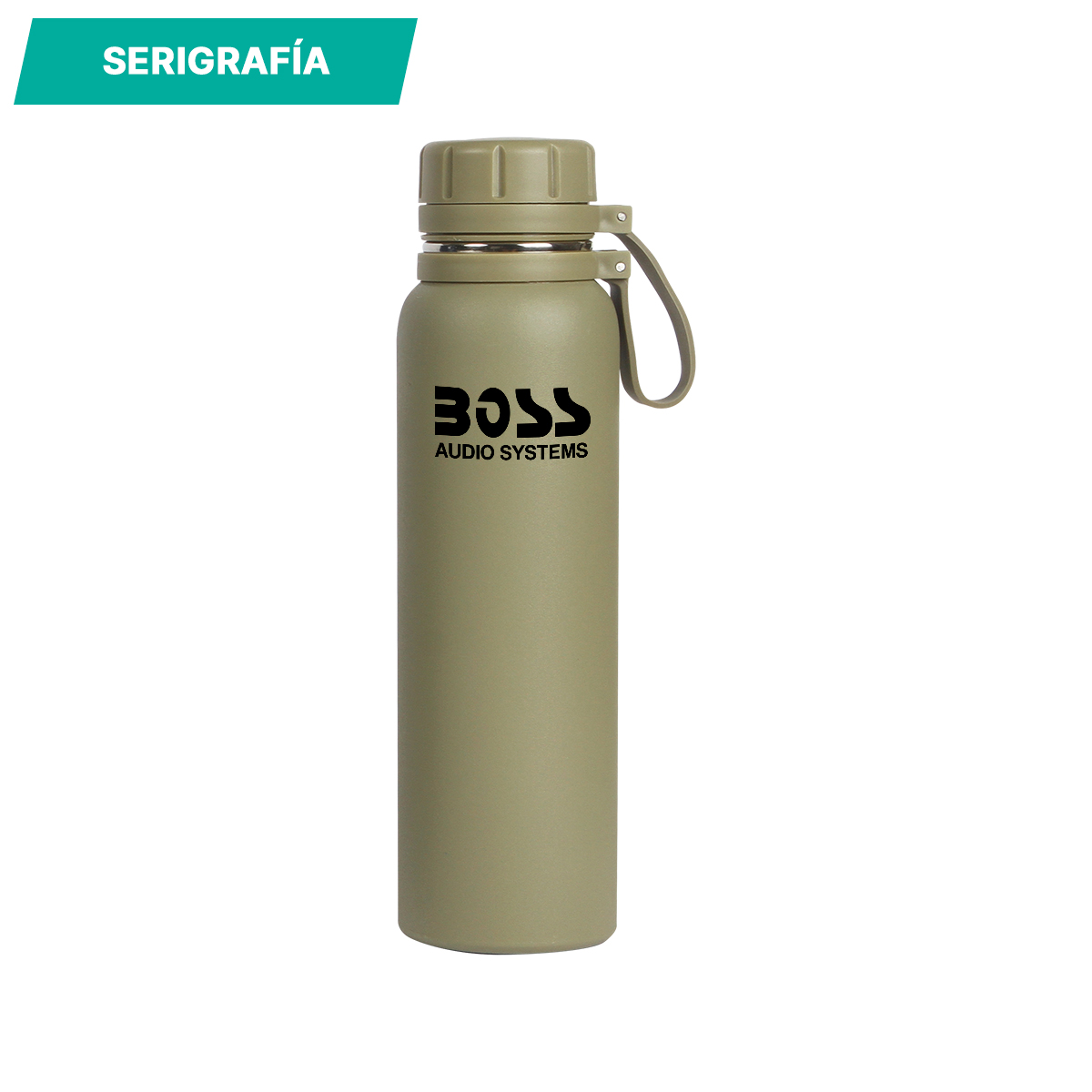 Termo de acero inoxidable doble pared acabado brillante, con tapa de plástico y correa de silicón. Fabricado en materiales de grado alimenticio, mantiene bebidas frías o calientes por un largo tiempo. No usar en microondas. Capacidad de 850 ml. Incluye caja de cartón individual.