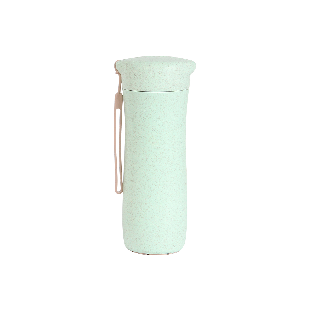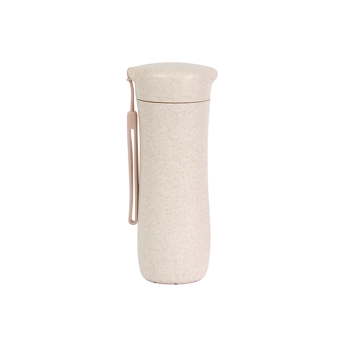Termo deportiva fabricada en polipropileno (PP) y fibra de trigo, con correa sujetadora. Capacidad de 360 ml.