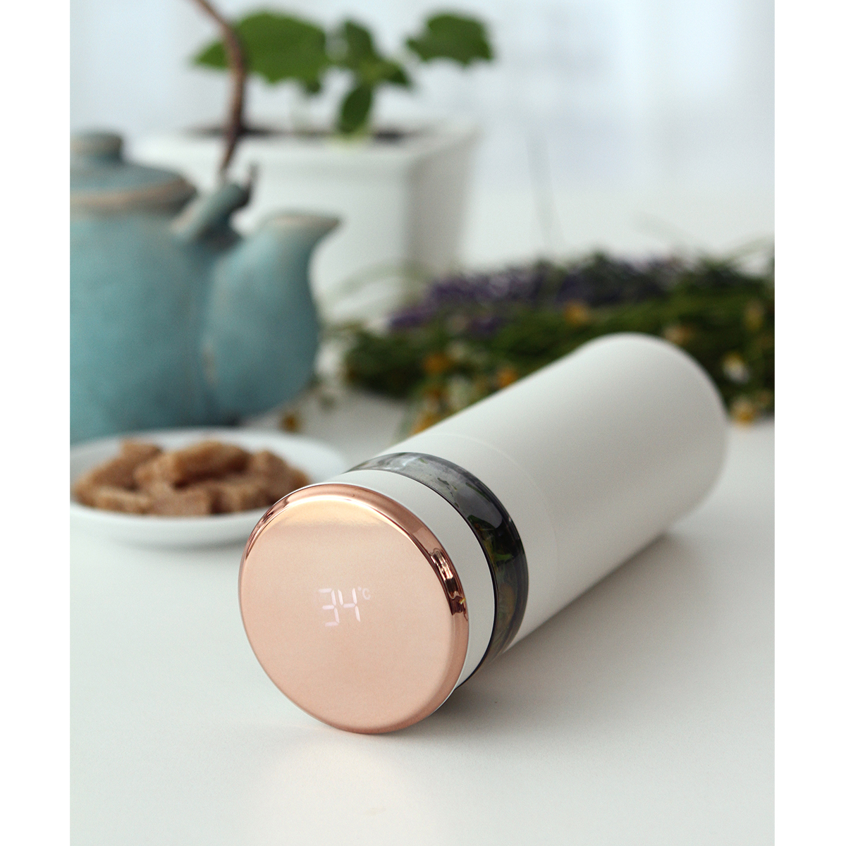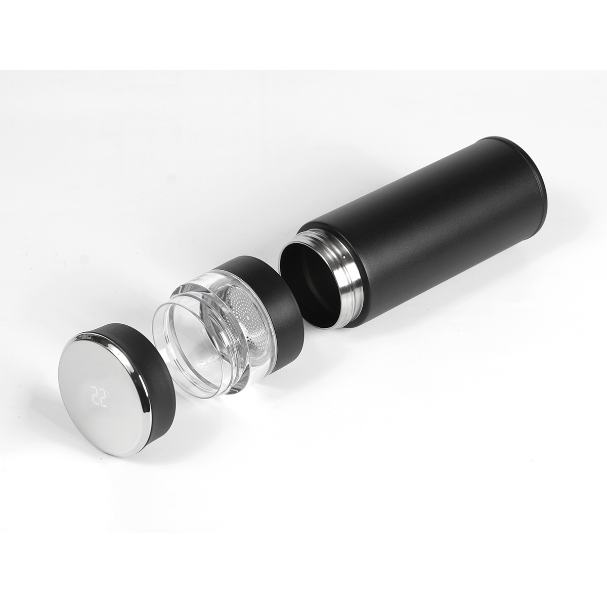 Termo de acero inoxidable doble pared con display de temperatura en la tapa, fabricada en materiales de grado alimenticio, mantiene bebidas frías o calientes por un largo tiempo. No usar en microondas. Capacidad de 400 ml. Incluye caja de cartón individual.