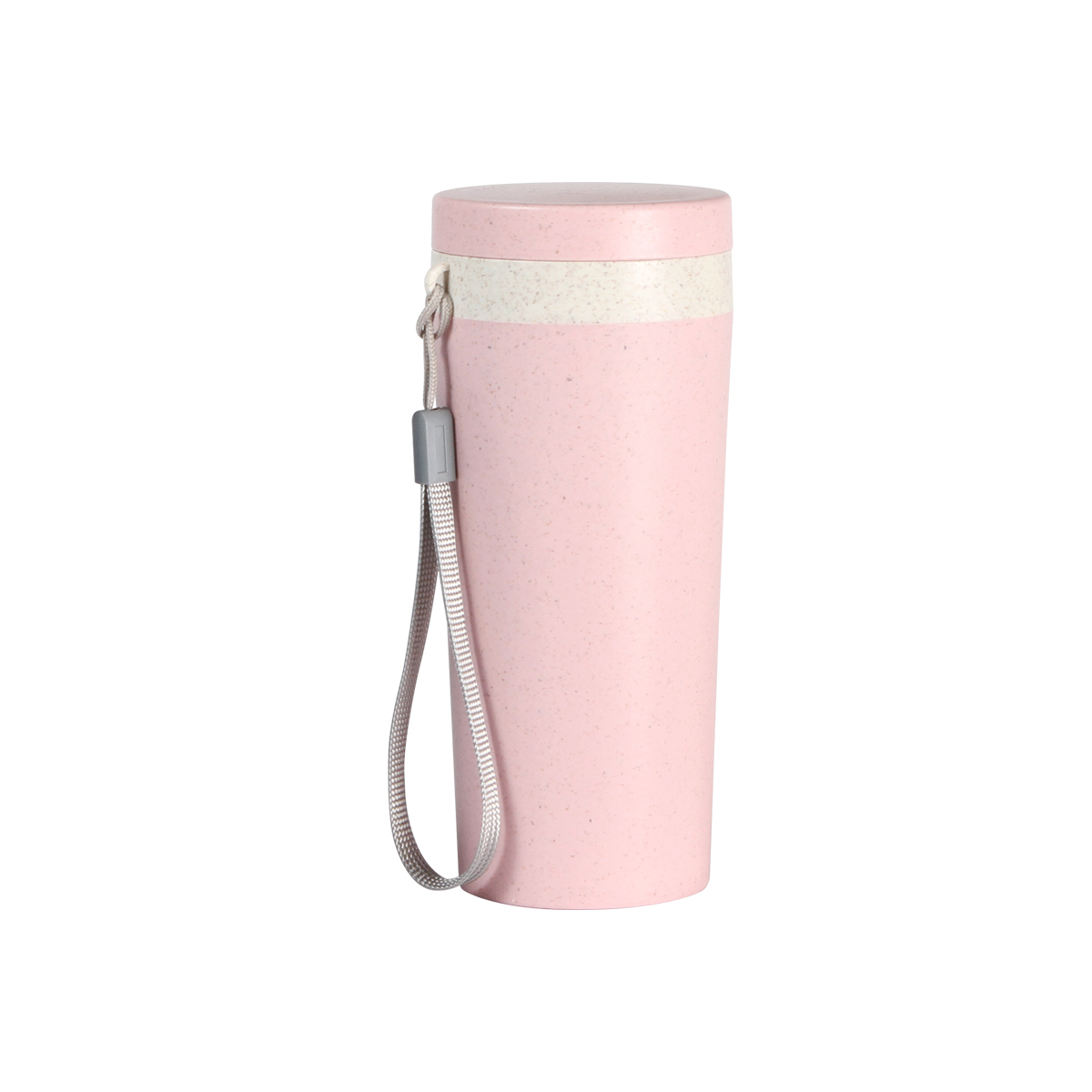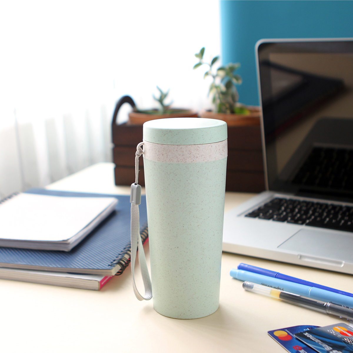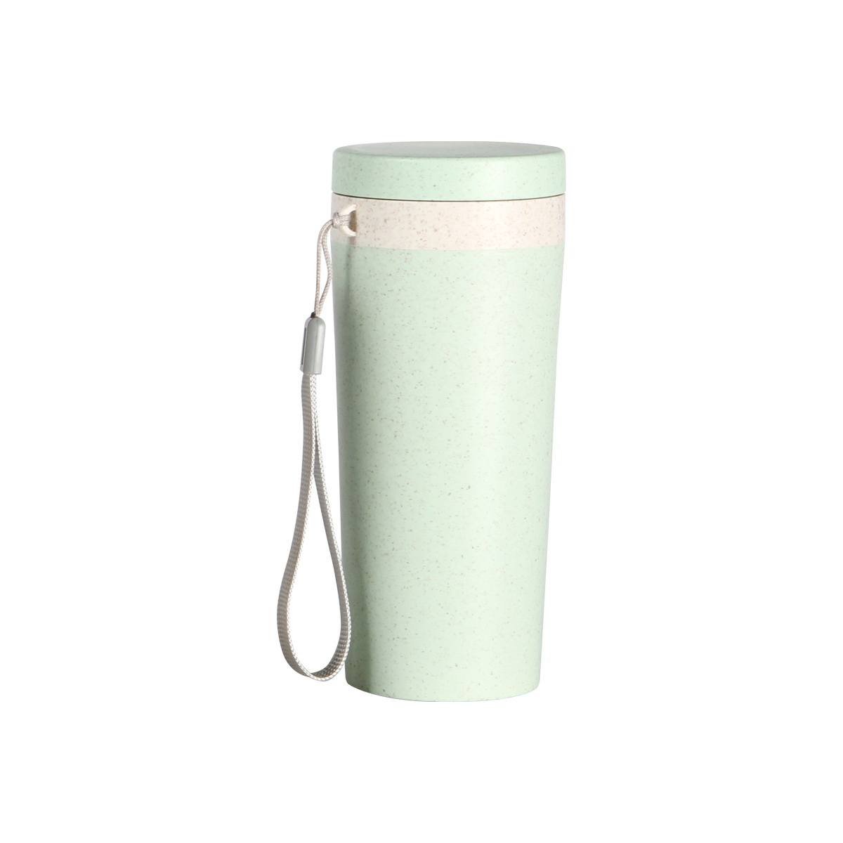 Termo doble pared fabricado en material Ecológico (Fibra de Trigo) con tapa de polipropileno, equipado con correa colgante. Capacidad de 300 ml. Producto biodegradable.