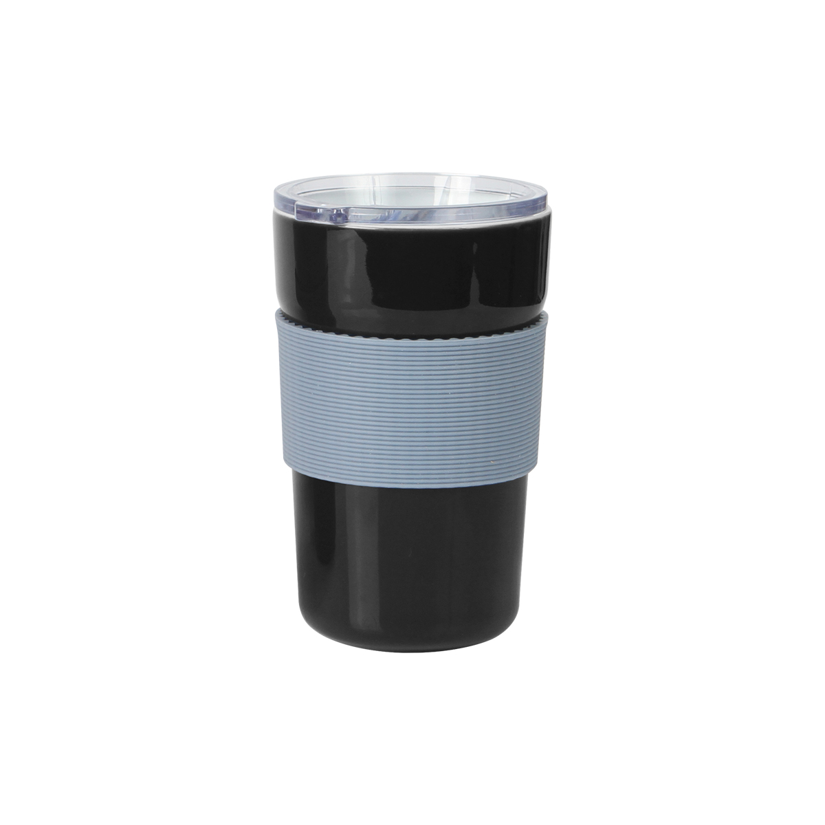 Vaso de cerámica con tapa deslizable de PP y manga de silicón en color gris. Fabricada con materiales de grado alimenticio, no usar en microondas. Capacidad de 400 ml. Incluye caja de cartón individual.