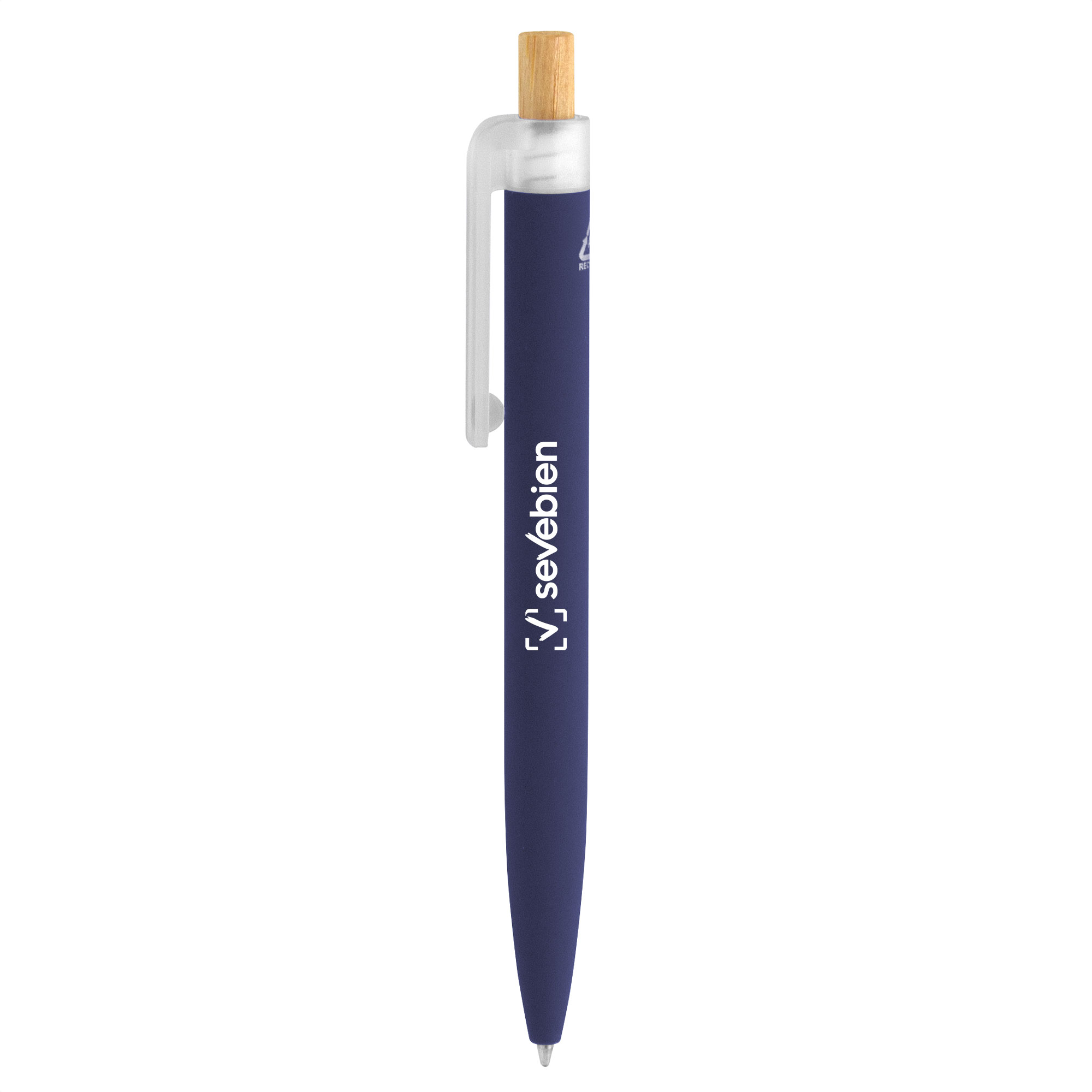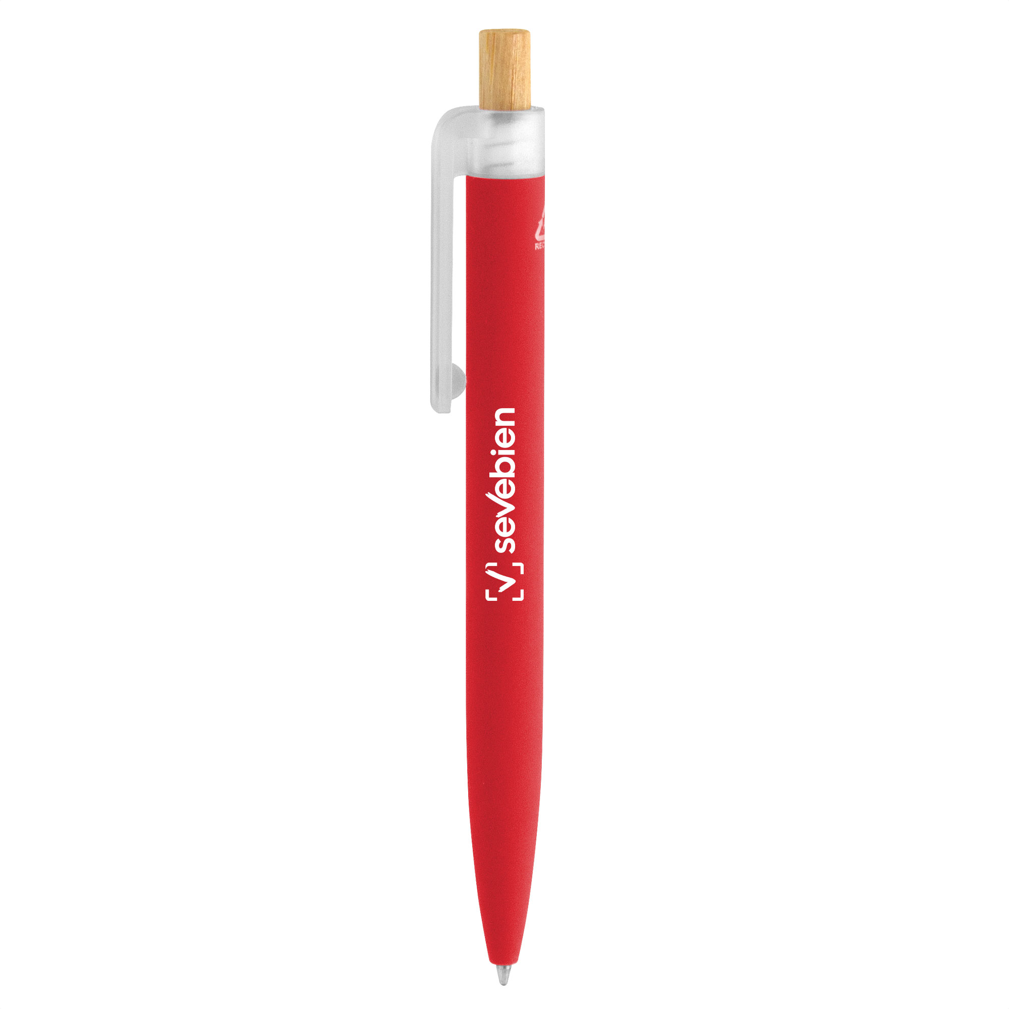 Fusiona lo moderno, elegante y ecológico.Bolígrafo retráctil. Cuerpo de alumio en diferentes colores acabado mate. Botón pulsador de bambú. Clip plástico transparente con terminación frosty. Medidas: 1,6 x 13,4 cm. Materiales: Aluminio reciclado, plástico RPET y bambú. Peso: 16,5 g. Tinta: negra.