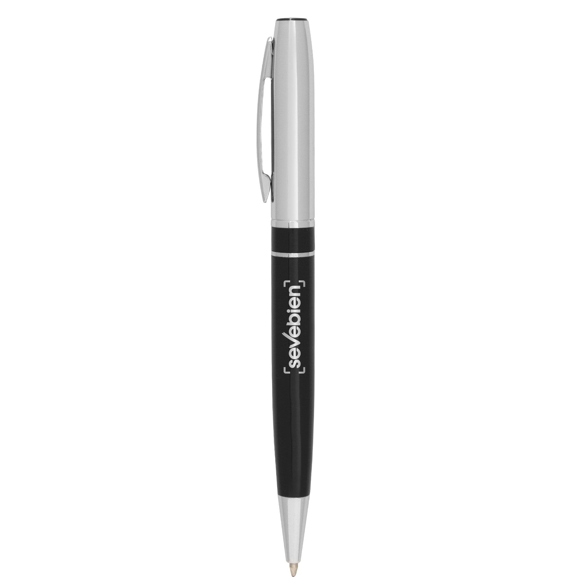 Metálico. Cuerpo color negro. Tambor superior, clip, anillo y puntera color plata. Apertura giratoria. Destape plata en la parte superior e inferior. Tinta negra. Presentación en caja de regalo.