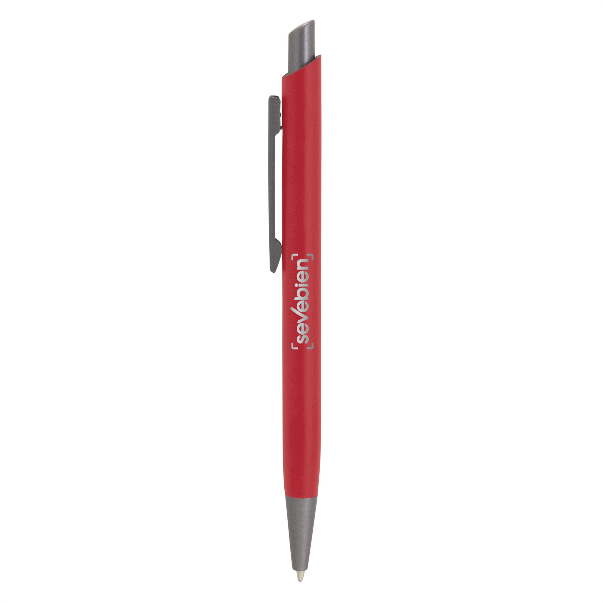 Aluminio, ABS, Acero. Boligrafo retráctil. Cuerpo revestido en laca de diferentes colores. Acabado mate. Pulsador, clip y puntera de color gris gun metal. Tinta negra. Amplia área de impresión.