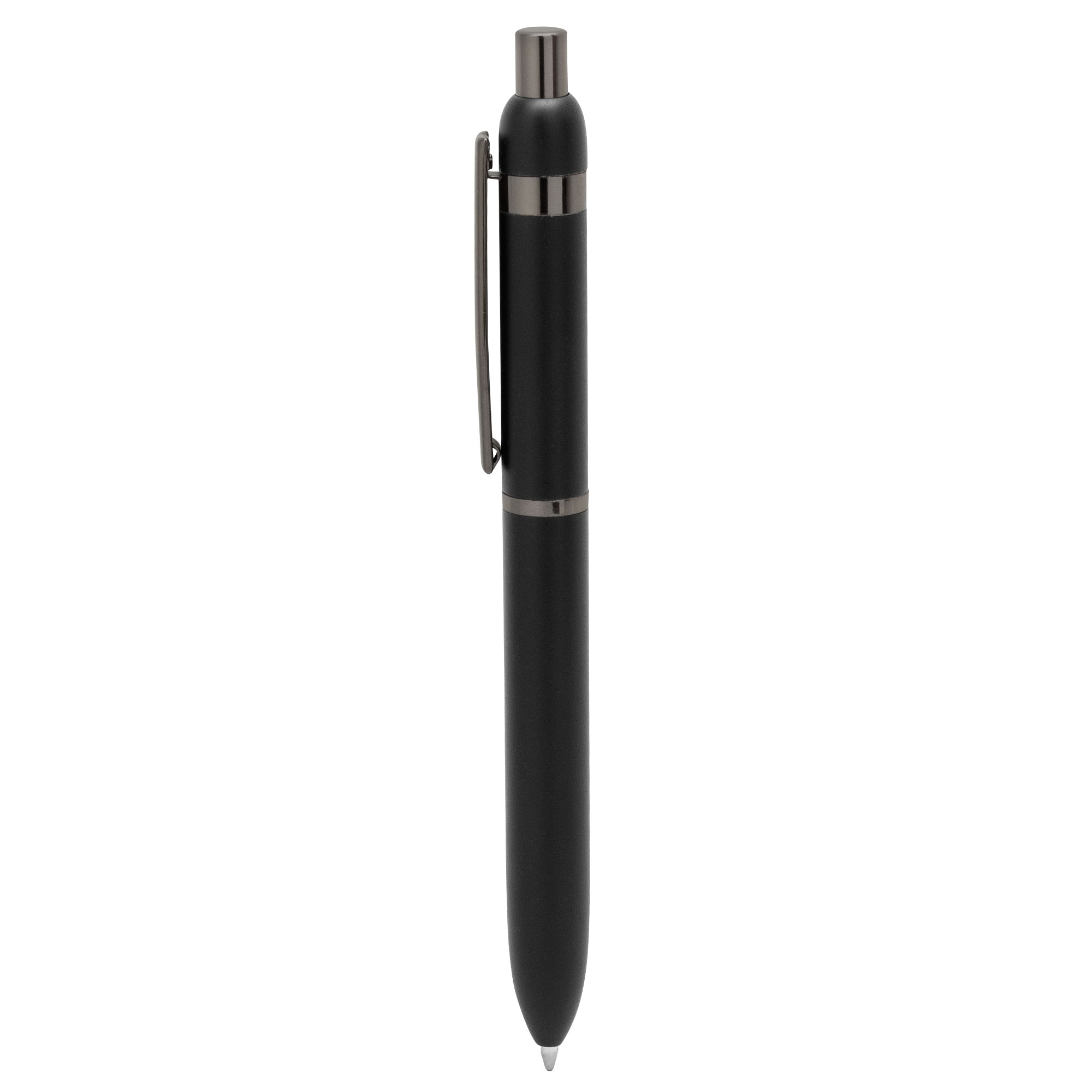 Metal. Cuerpo de aluminio. Bolígrafo retráctil. Clip, botón y anillos metálicos color plata. Tinta Negra. Decapa color plata tanto en el cuerpo como en la tapa. Presentación en estuche con cierre magnético.