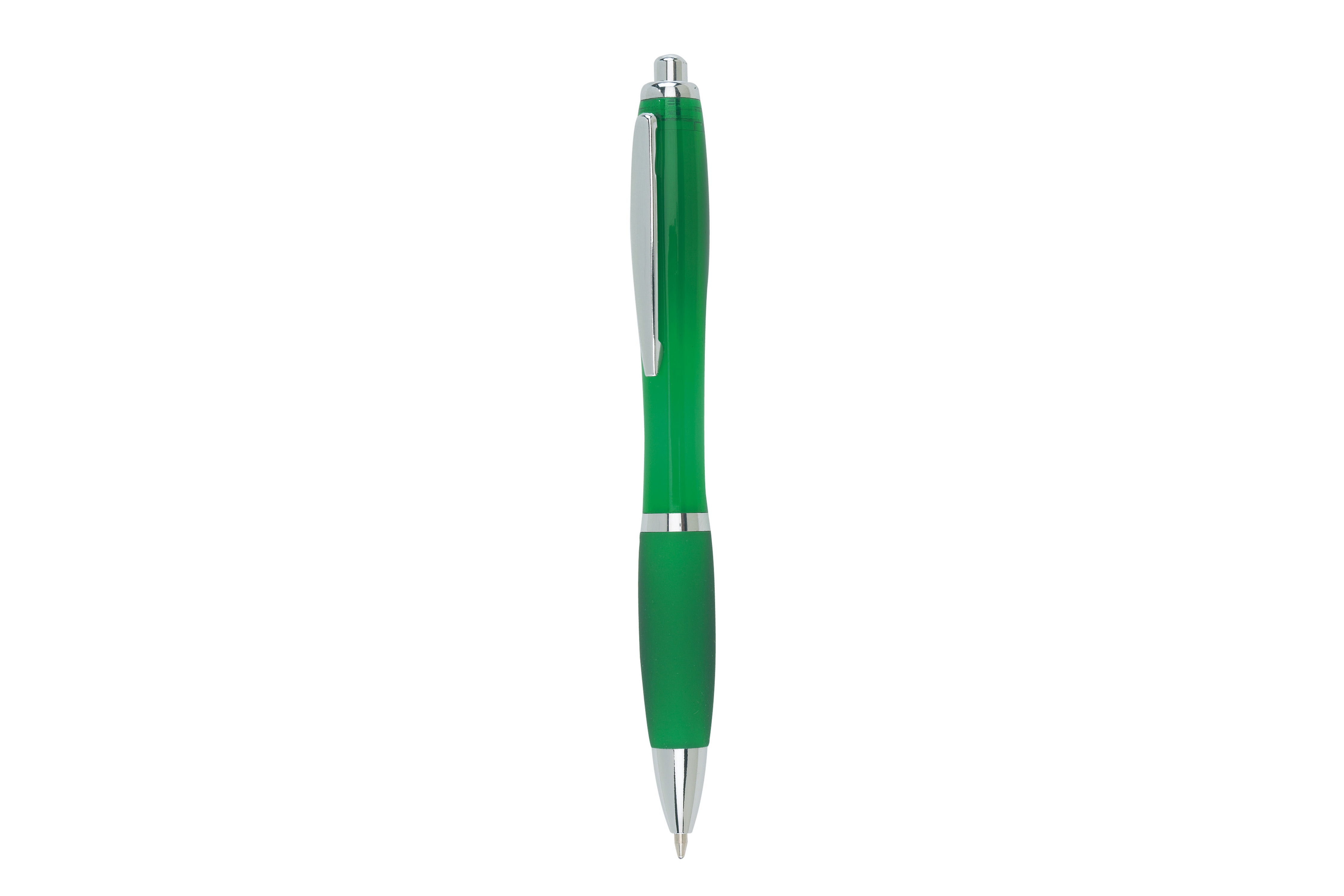 Plastico. Cuerpo curvo. Pulsador, clip, puntera y detalles en color plata. Grip de goma de color. retractil. Tinta negra.