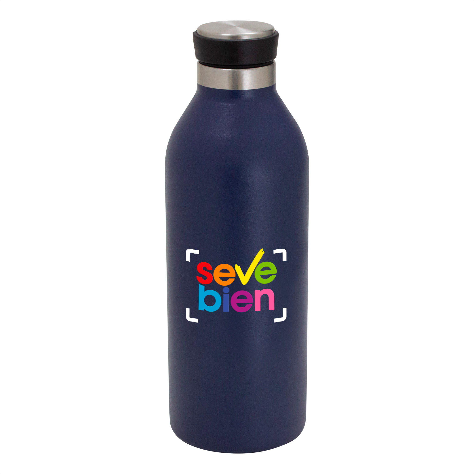 Ø 7,2 cm x 21,5 cm. Capacidad 500 ml. Acero inoxidable. Botella doble pared, sellada al vacío. Interior en acero 304 y exterior en acero 201. Pintura acabado mate. Tapa de polipropileno, acero inoxidable 201 y anillo de silicona. Mantiene por más de 12 hs la temperatura de las bebidas calientes y 24 hs de las bebidas frías. Presentación en caja de regalo kraft.