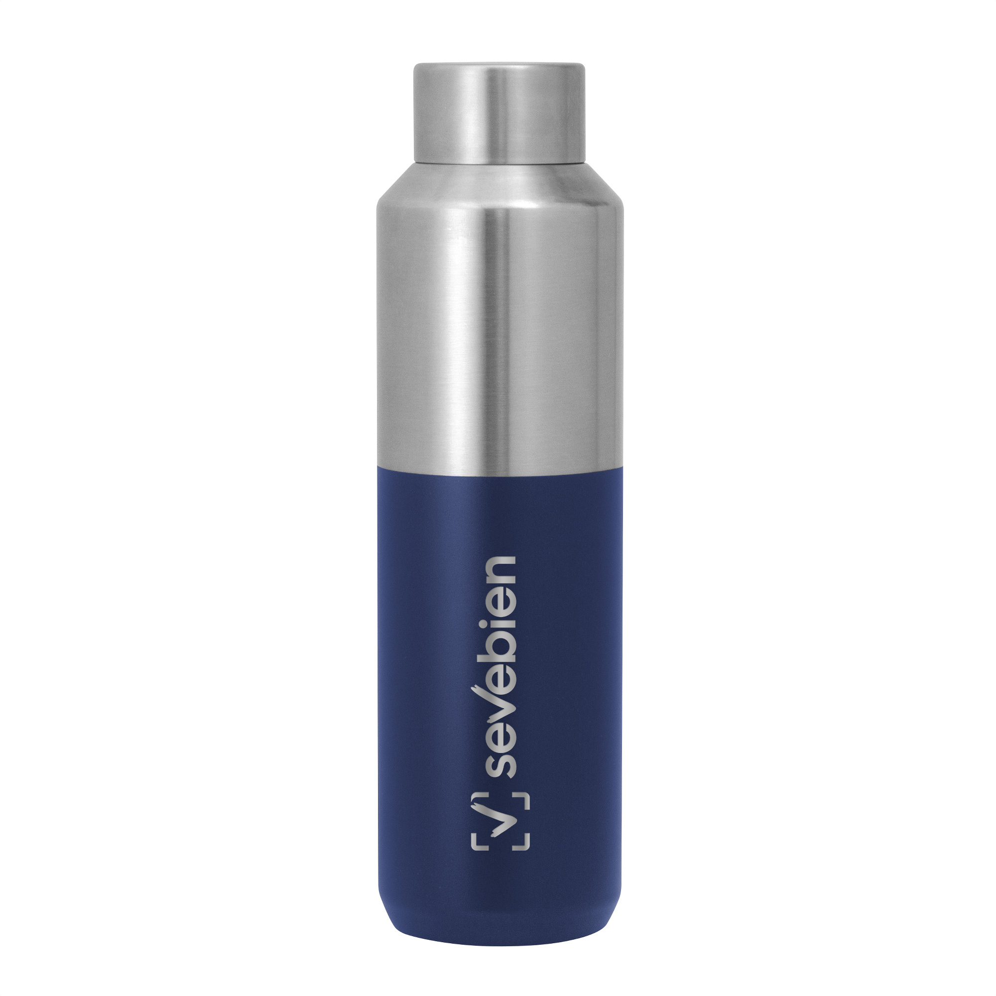 Aislamiento Superior para Bebidas Calientes y Frías.Botella doble pared, sellada al vacío.  Interior de acero 304 y exterior de acero 201. Tapa a rosca de acero 201 con anillo de silicona. Pintura acabado mate en parte inferior. Mantiene por más de 12 hs la temperatura de las bebidas calientes y 24 hs de las bebidas frías. Medidas: Ø 7 cm x 24,5 cm.  Capacidad: 600 ml. Materiales: Acero inoxidable.   Presentación: en caja de regalo kraft.