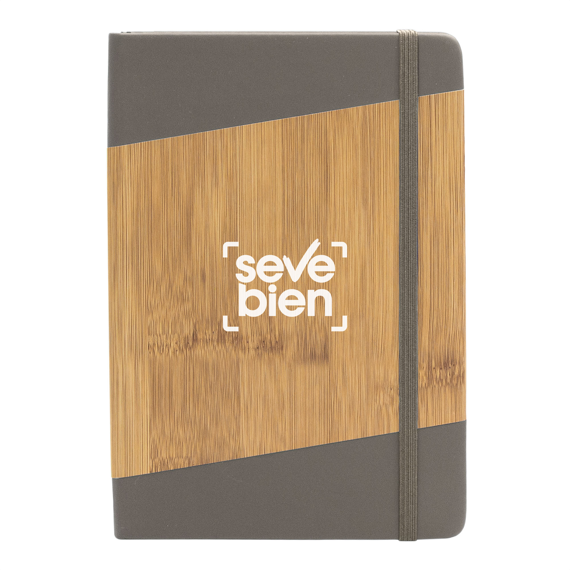 21 x 14 cm. (A5). PU + Papel. Libreta. Tapa dura recubierta en PU, con estampado simil bambú. Interior 80 hojas rayadas en papel de 70 g. Cinta señaladora y cierre con banda elástica del mismo color.