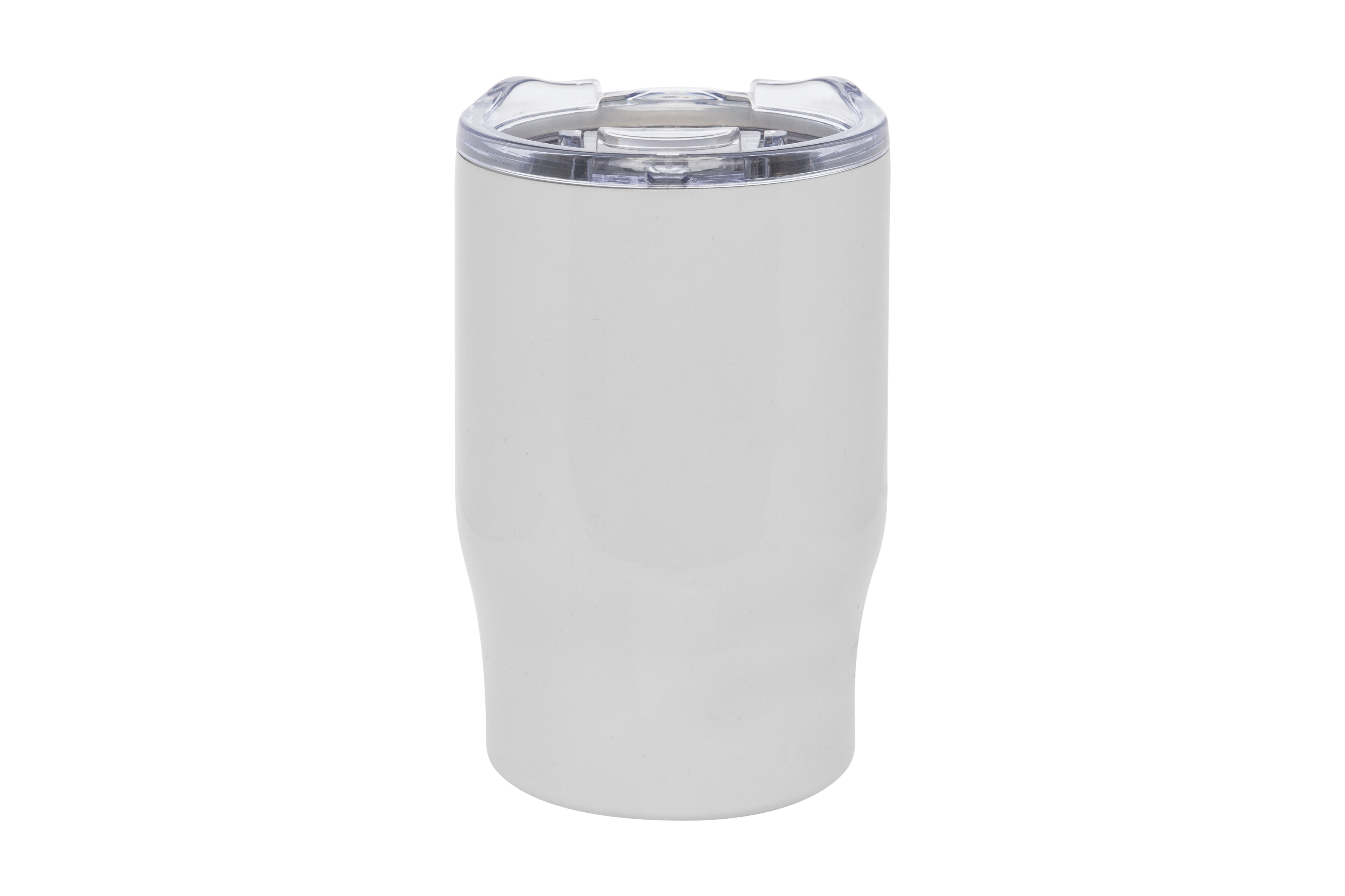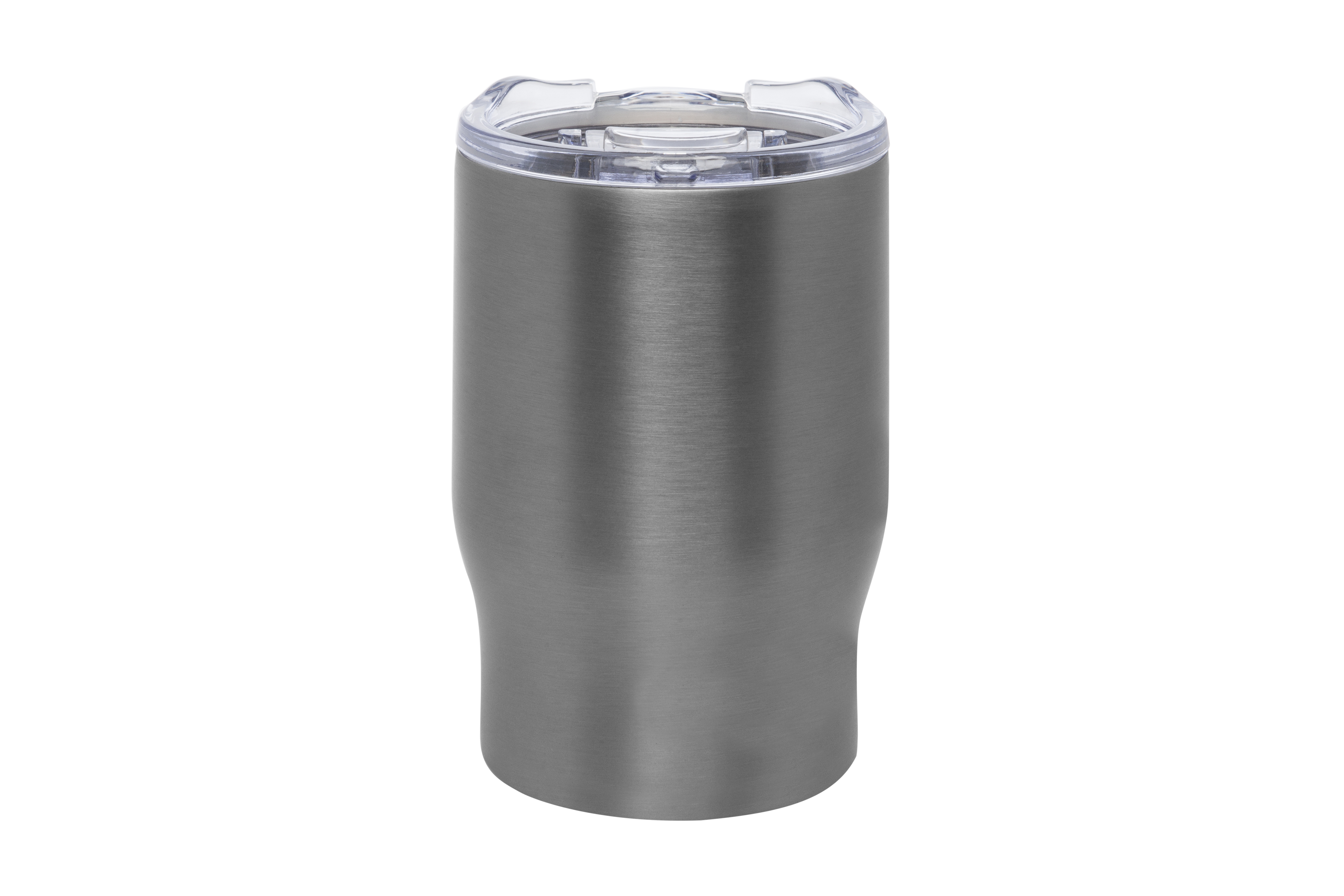 8,5 x 13,3 cm. Acero inoxidable. Capacidad 350 ml. Doble pared metalica. Tapa plastica transparente a rosca con cierre anti derrame.