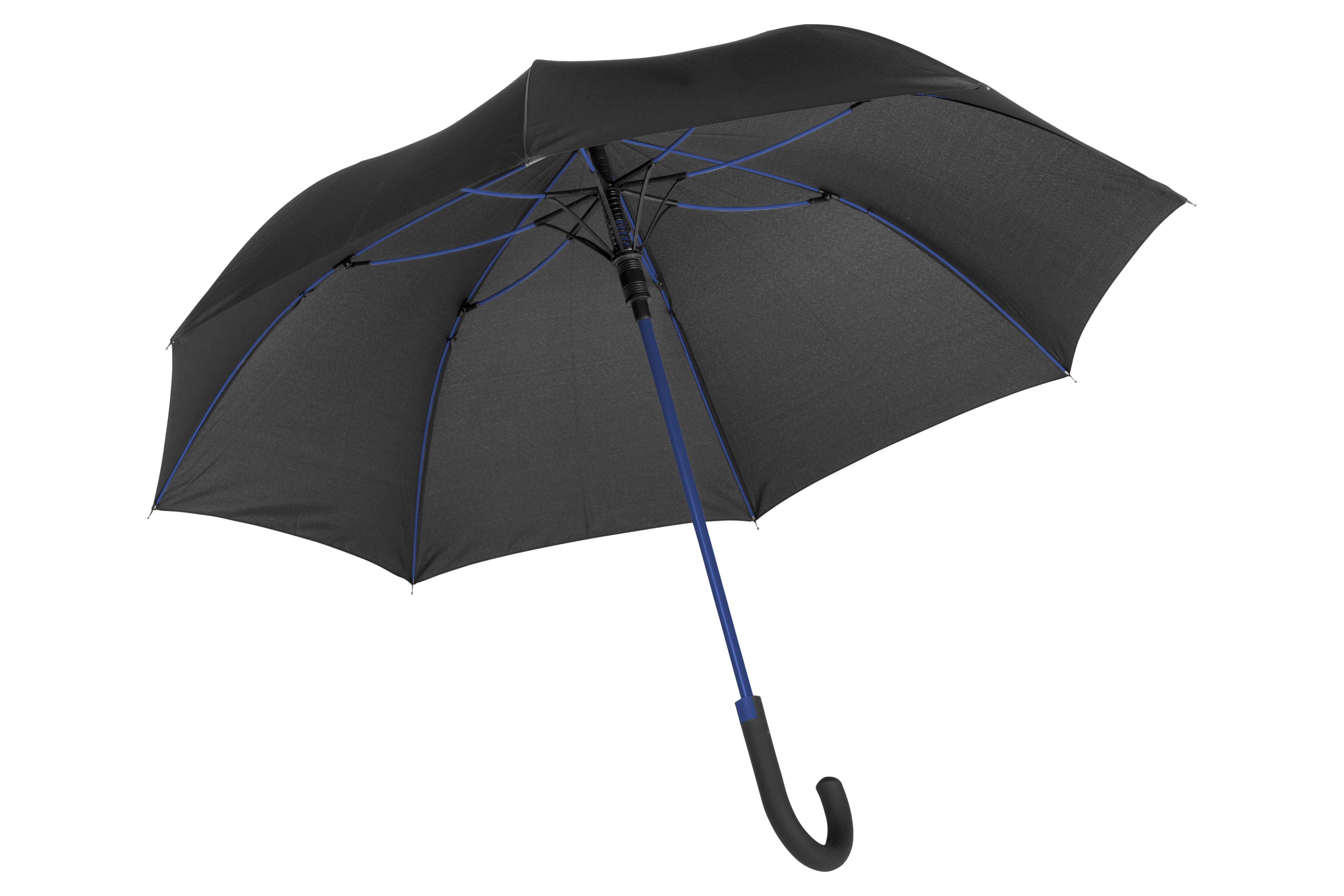 103 cm. Polyester. Paraguas automatico con sistema antiviento. Eje de metal y varillas de fibra de vidrio de color, puntas metalicas, mango curvo de goma con boton de color, revestimiento de polyester pongee, cierre con correa de velcro.