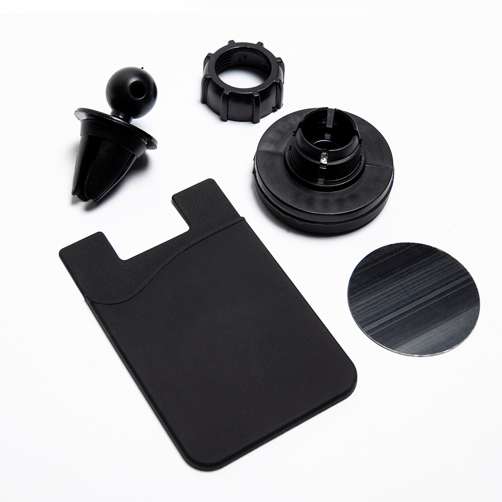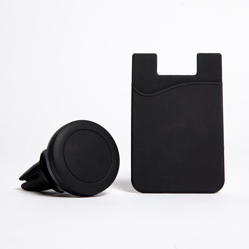 Bolsillo - tarjetero para celulares de silicon con placa de metal que se fija a un soporte magnetico. El soporte magnetico se ajusta en las ranuras de ventilacion de un automovil.