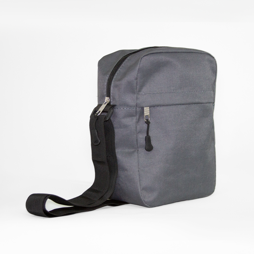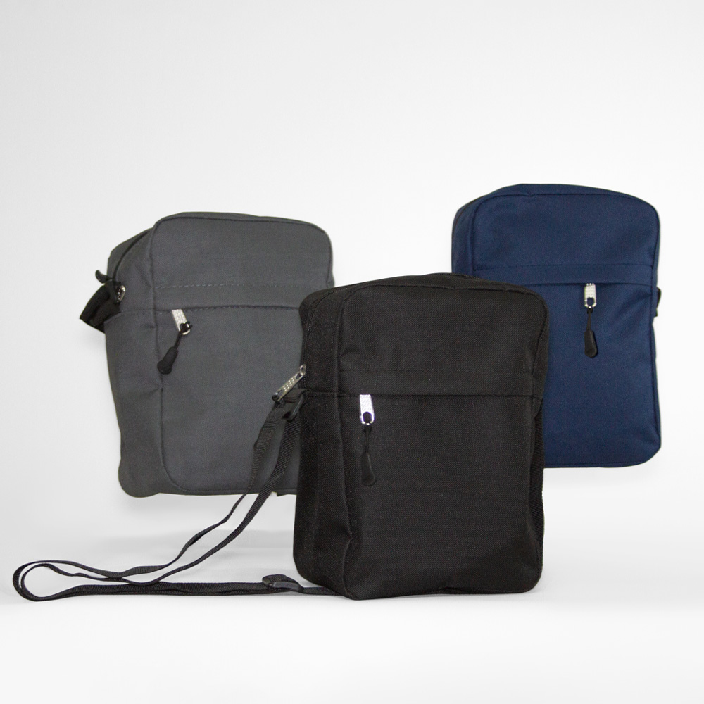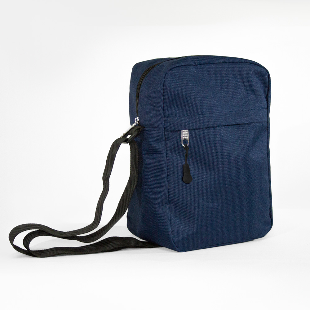 Bolsa bandolera de poliéster con compartimento principal y un compartimento frontal. Incluye correa ajustable.
