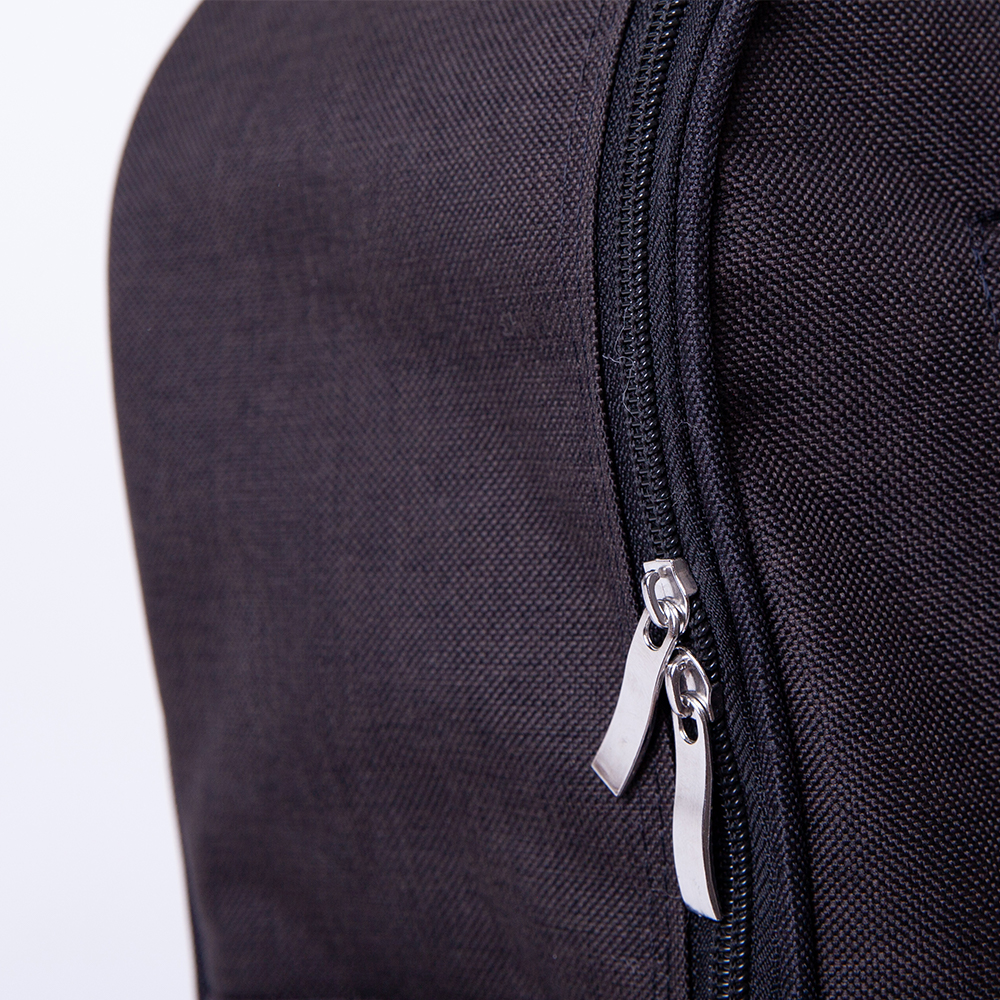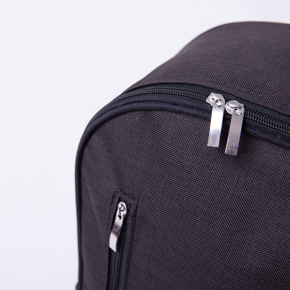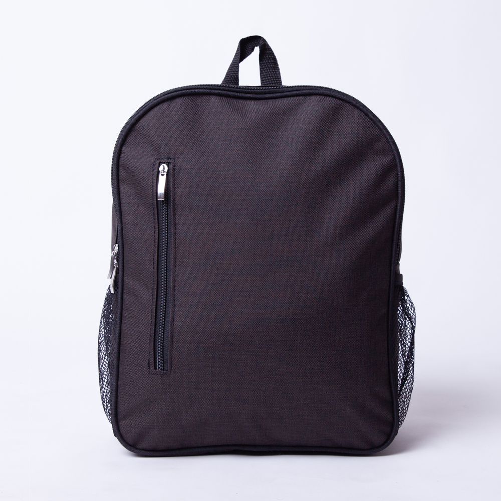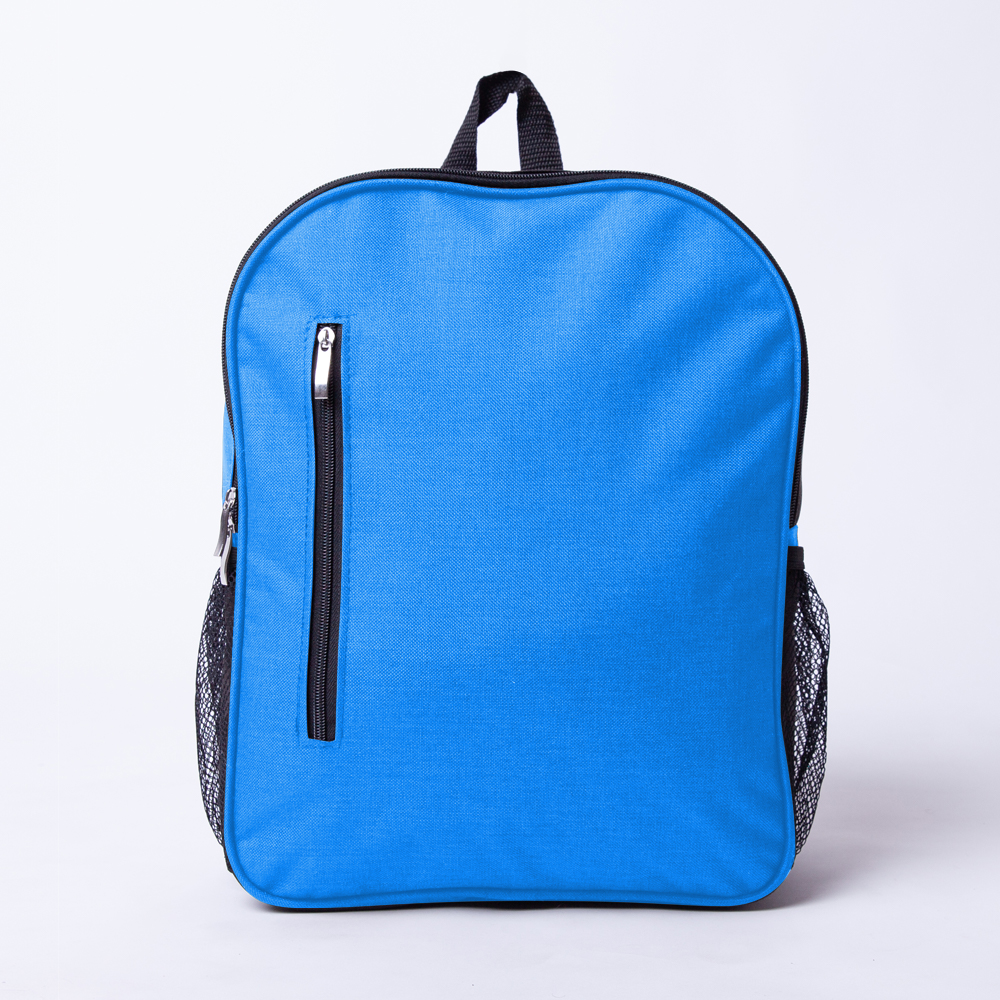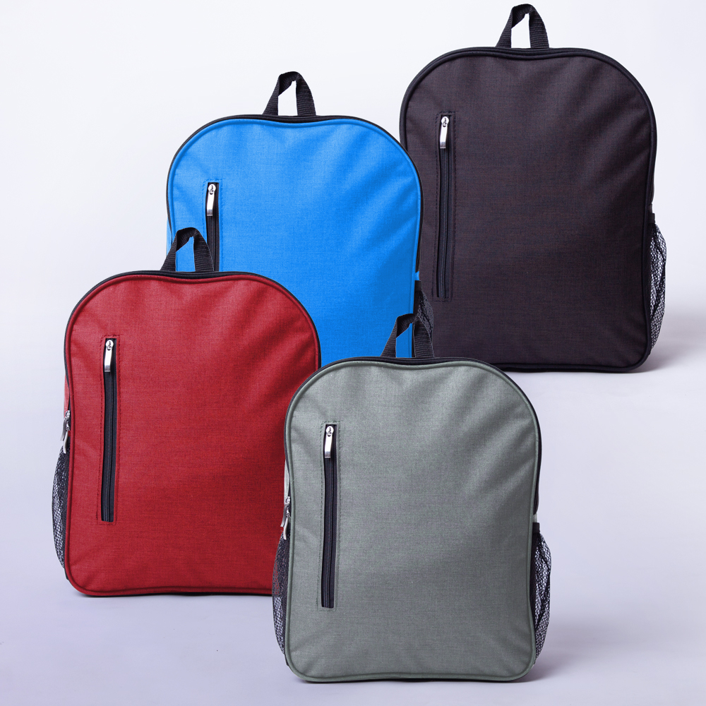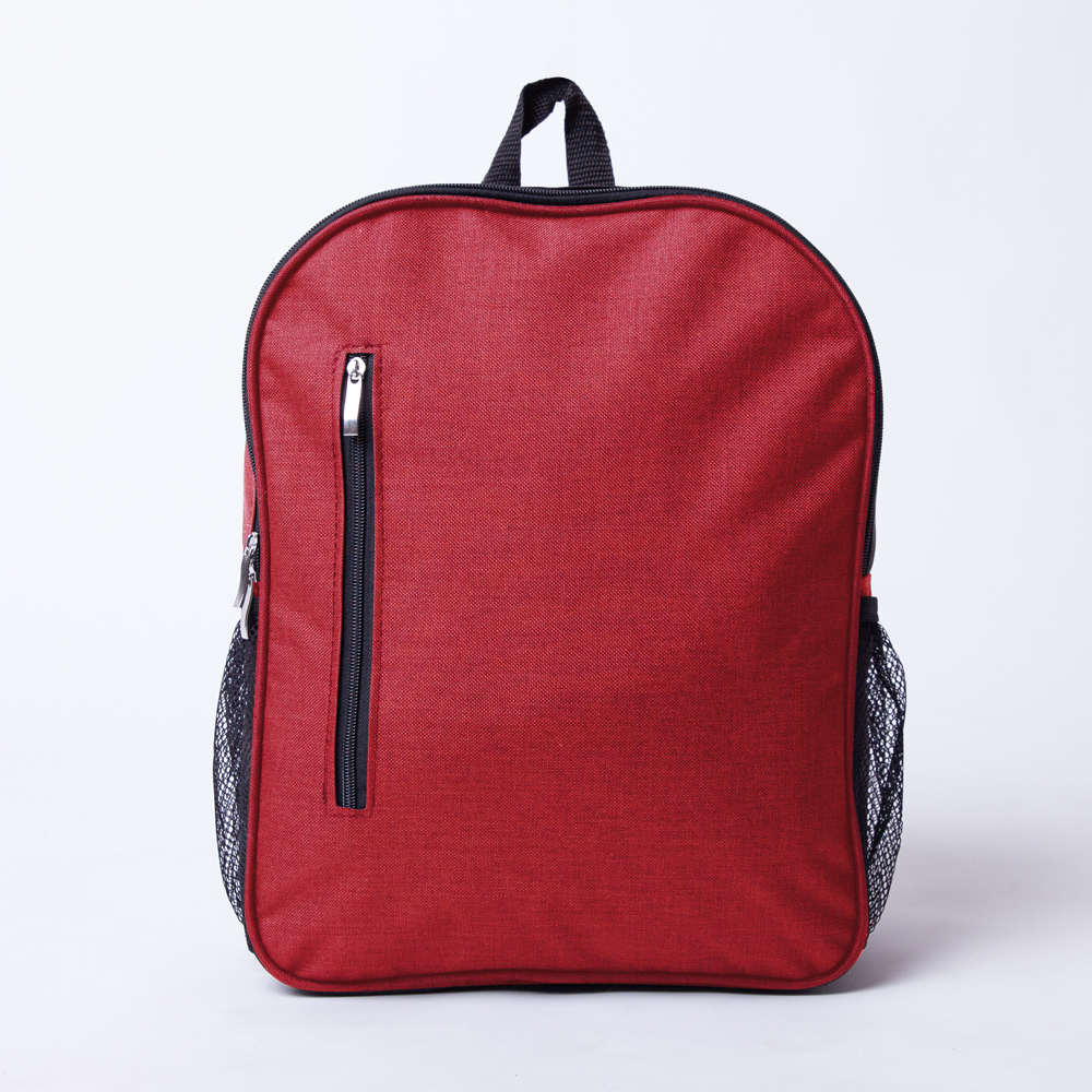Mochila de poliéster, con dos compartimientos de cierre y bolsas laterales de malla.