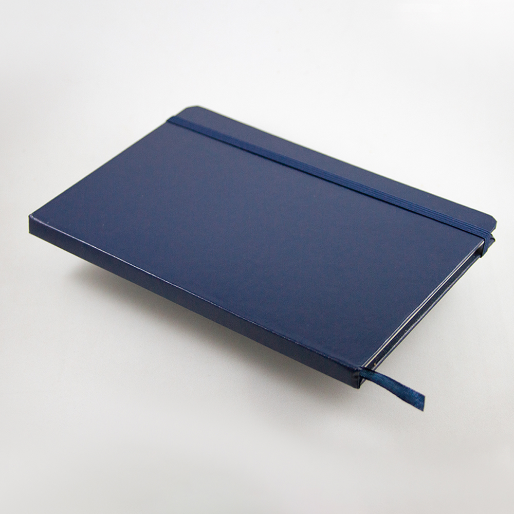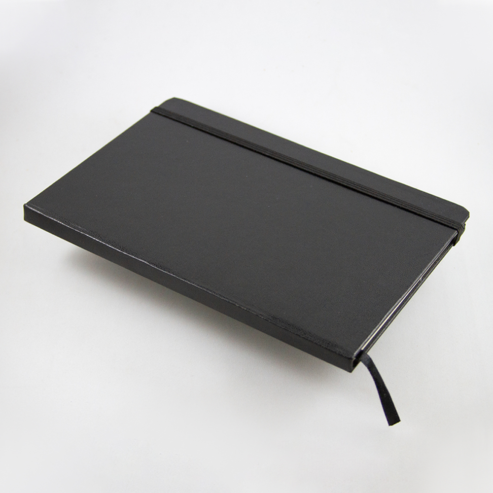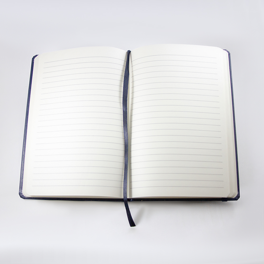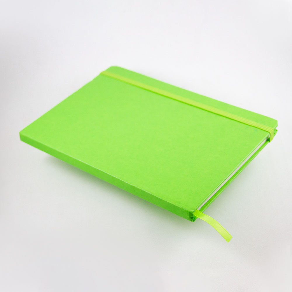 Libreta de cubierta dura plastificada, banda elástica y separador con 80 hojas rayadas.
