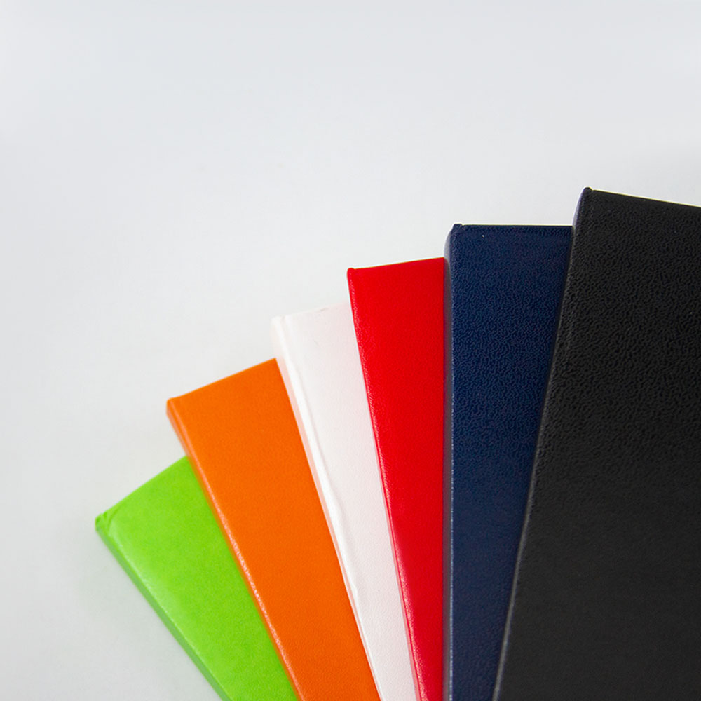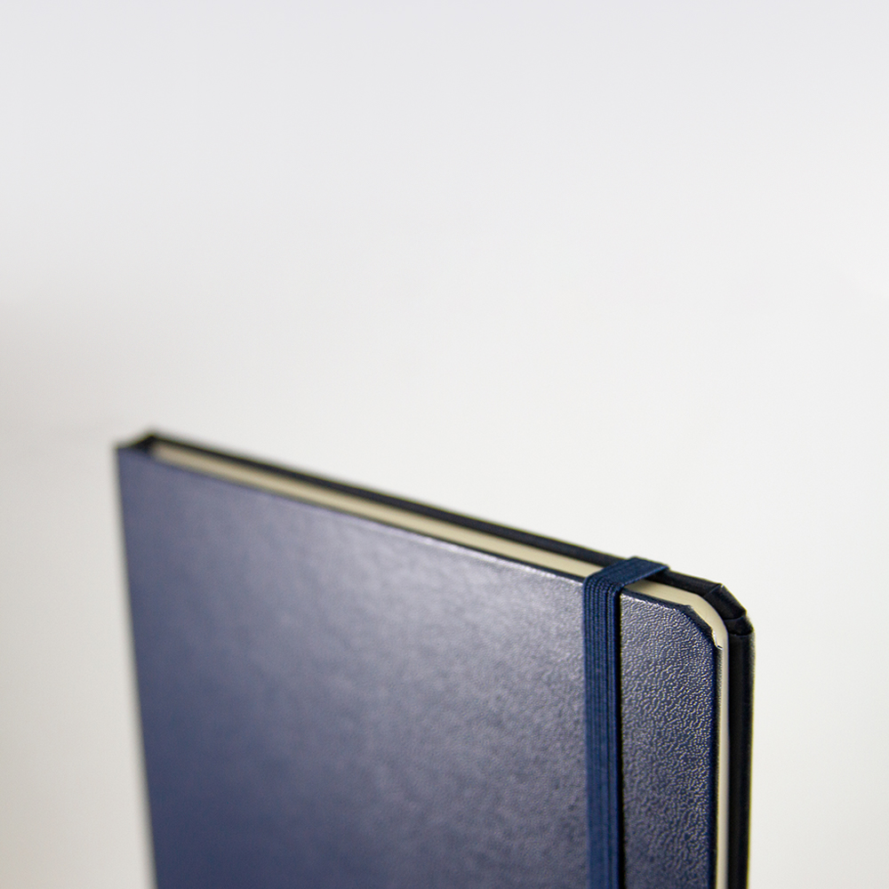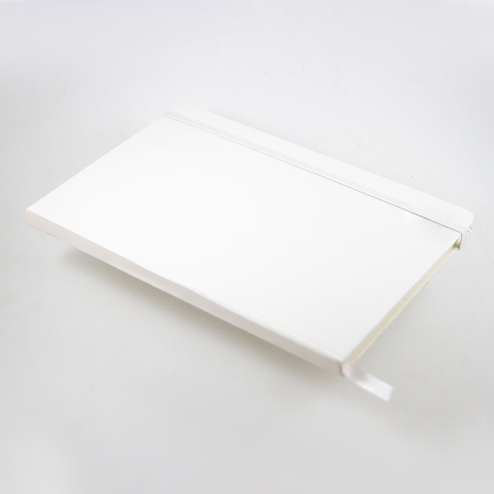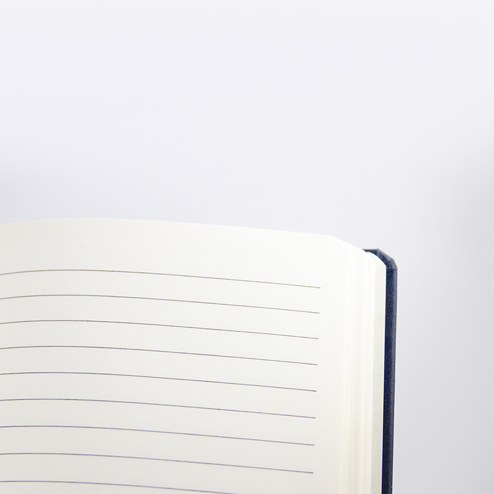 Libreta de cubierta dura plastificada, banda elástica y separador con 80 hojas rayadas.