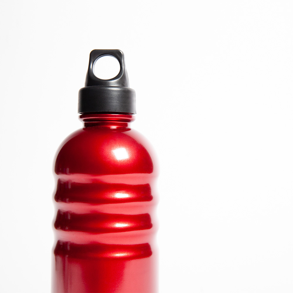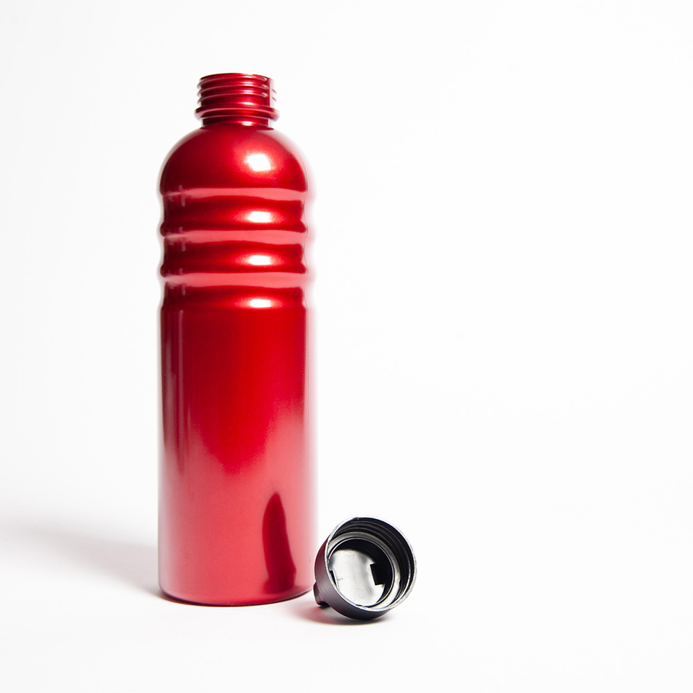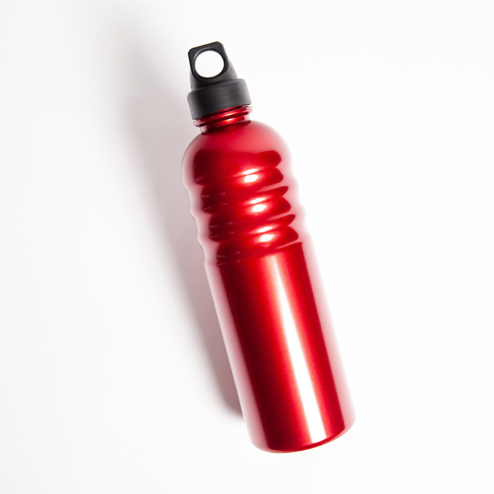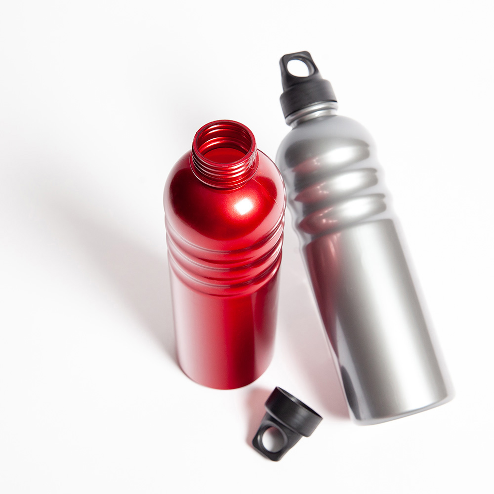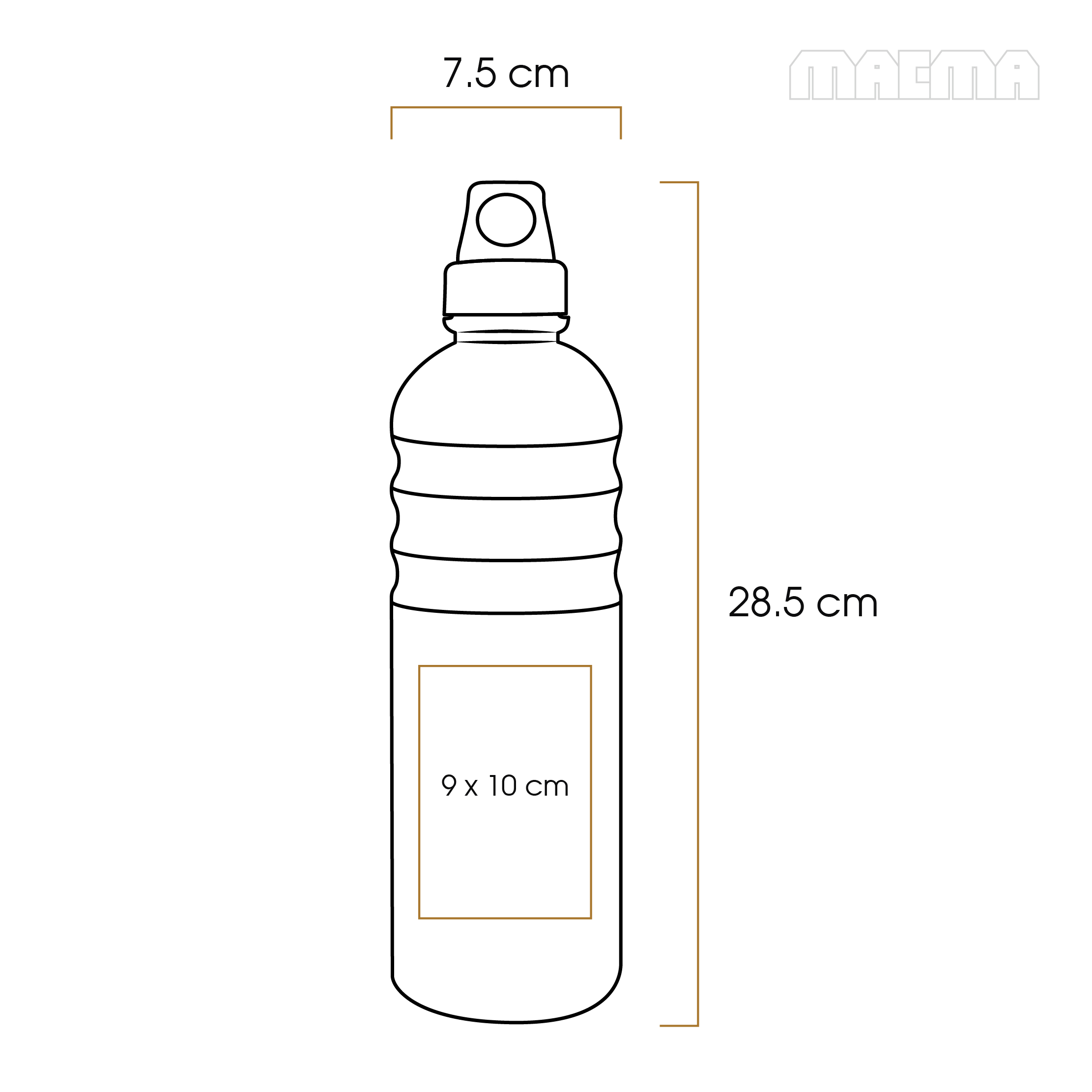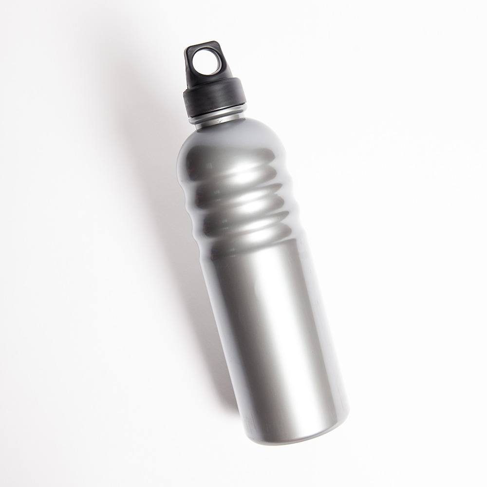 Cilindro de plástico PET con terminado metálico con tapa de rosca anti derrames y capacidad de 1000 ml. Libre de BPA y certificación FDA.