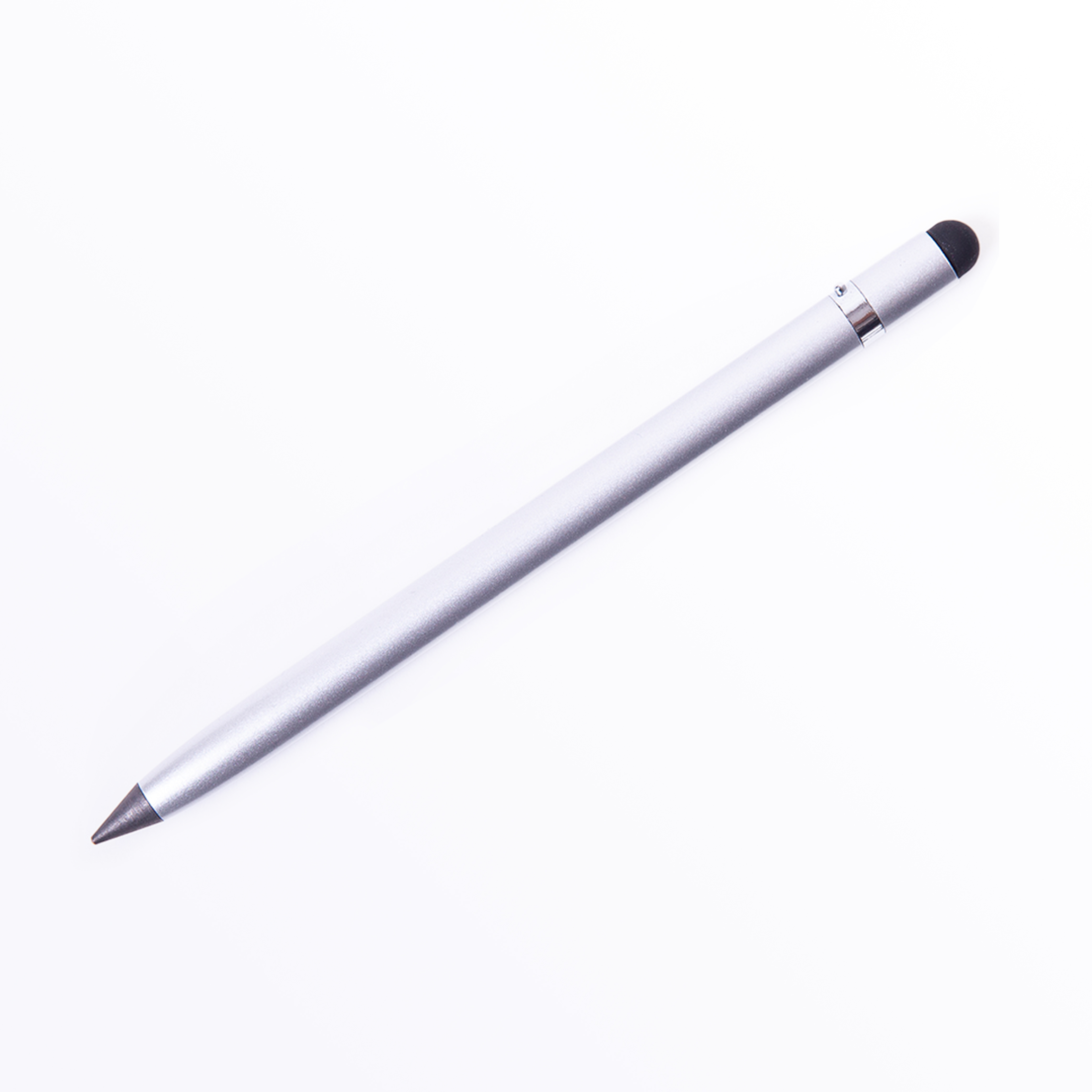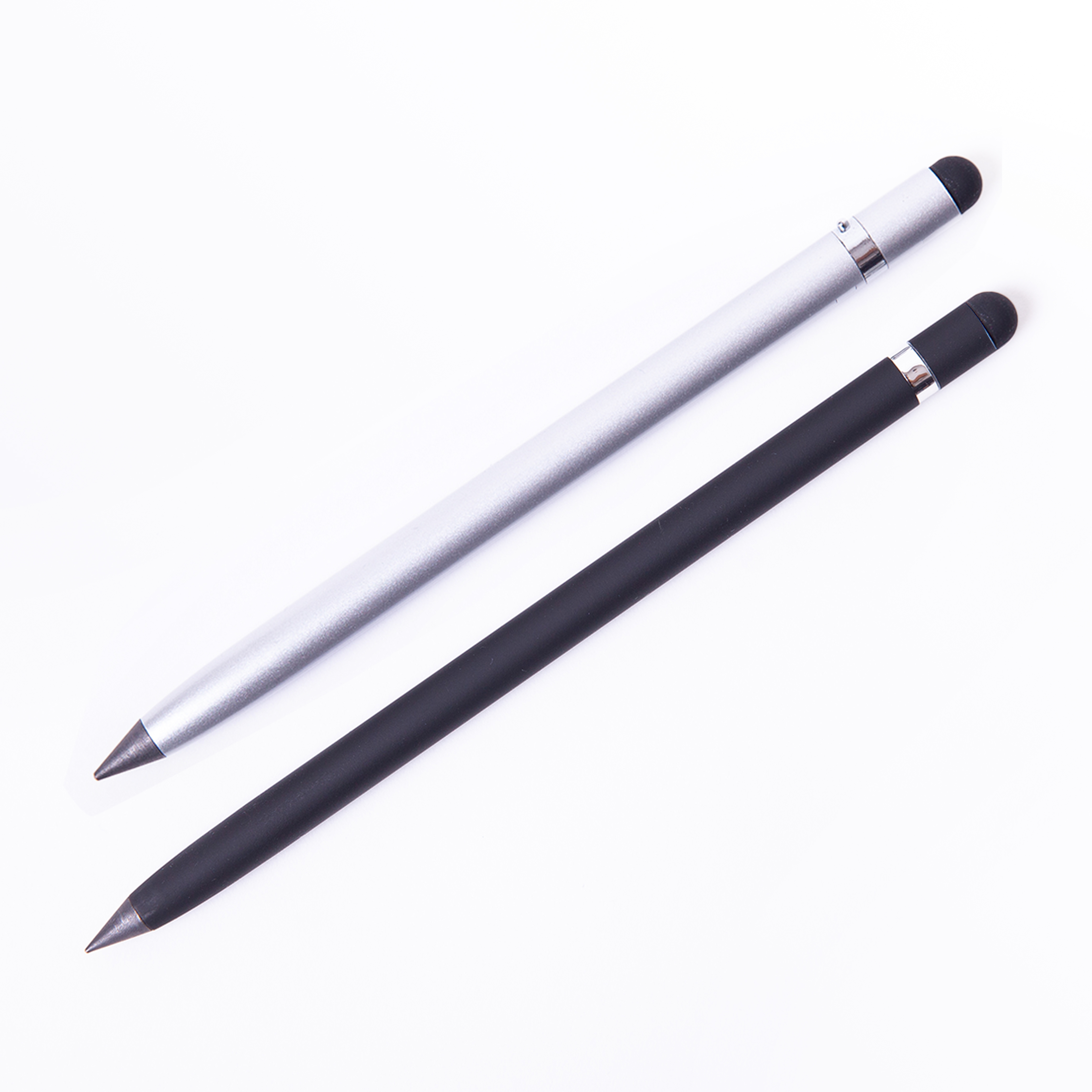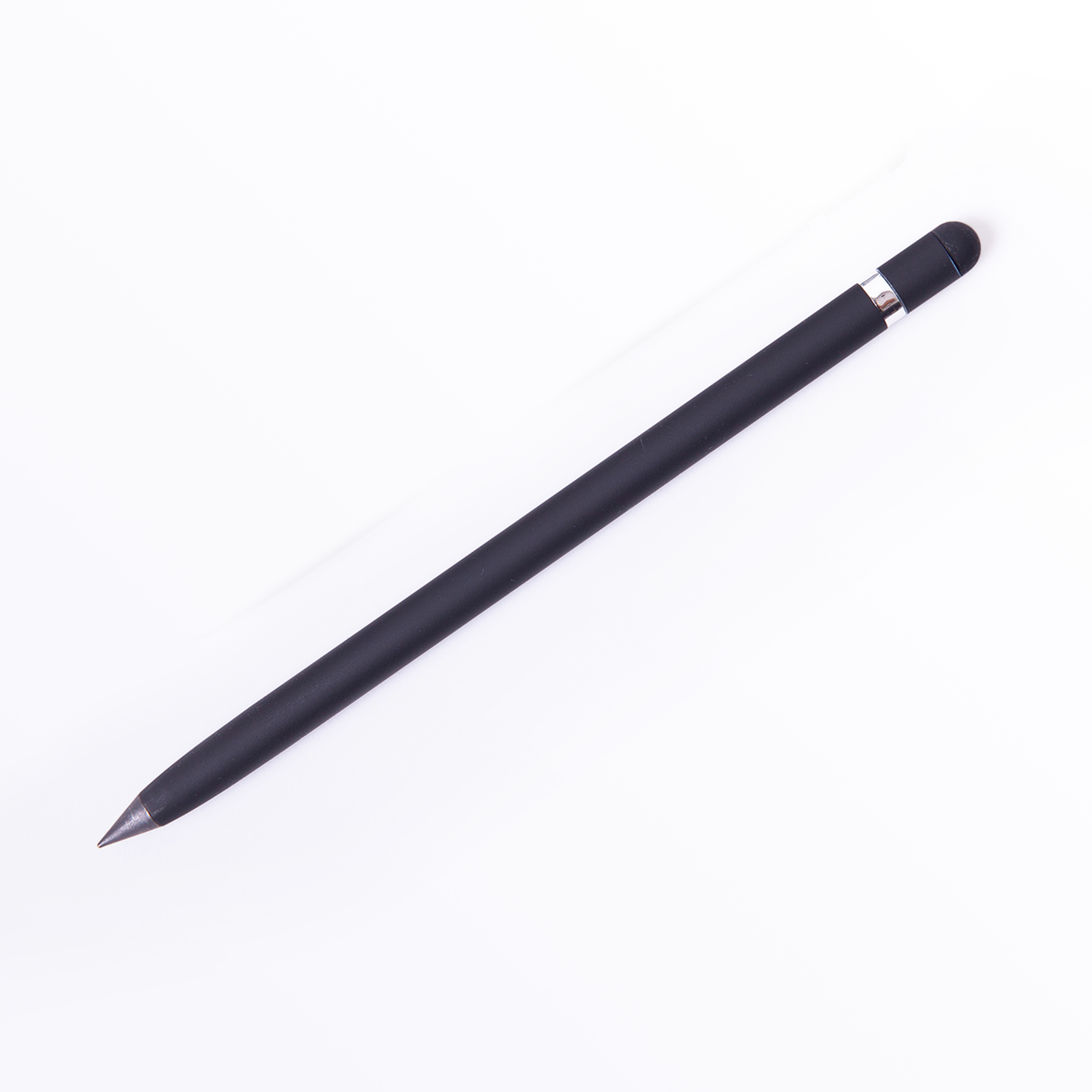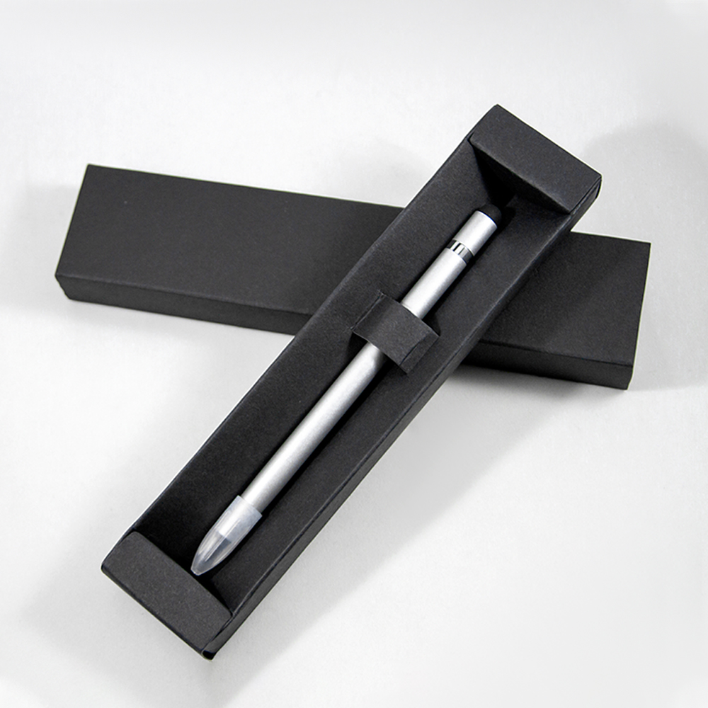 Bolígrafo metálico ecológico con punta de escritura infinita que simula un lápiz. Cuenta con borrador y función touch.