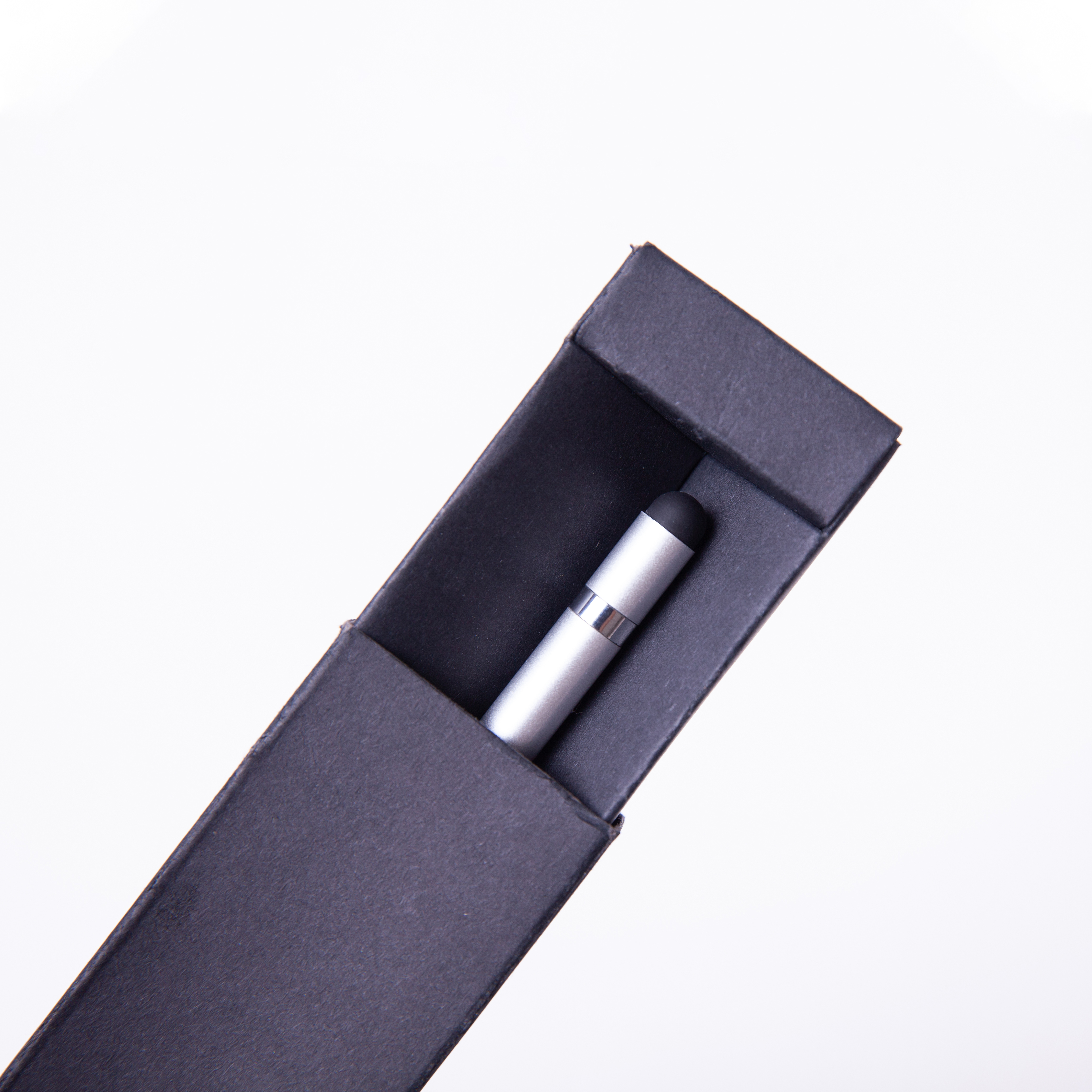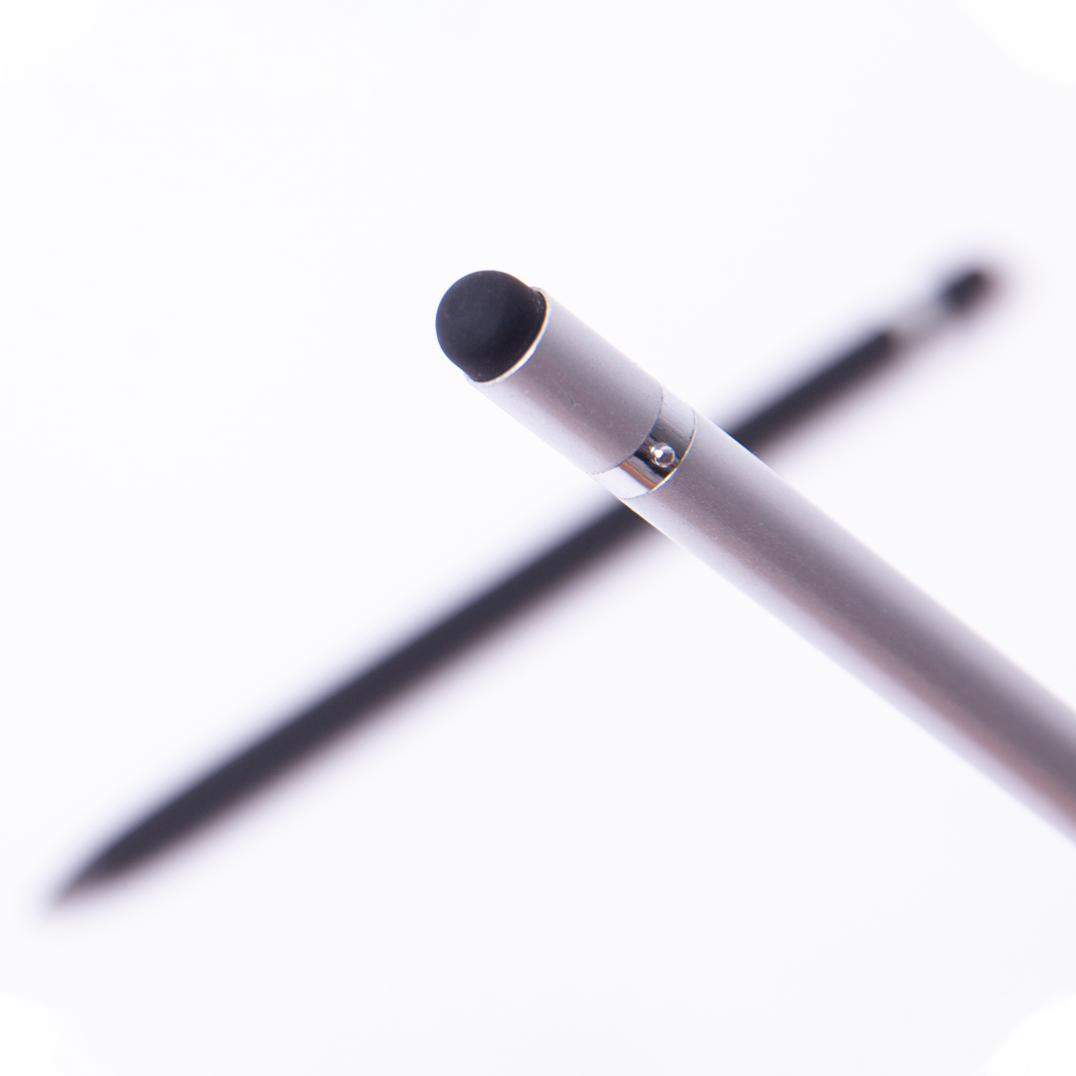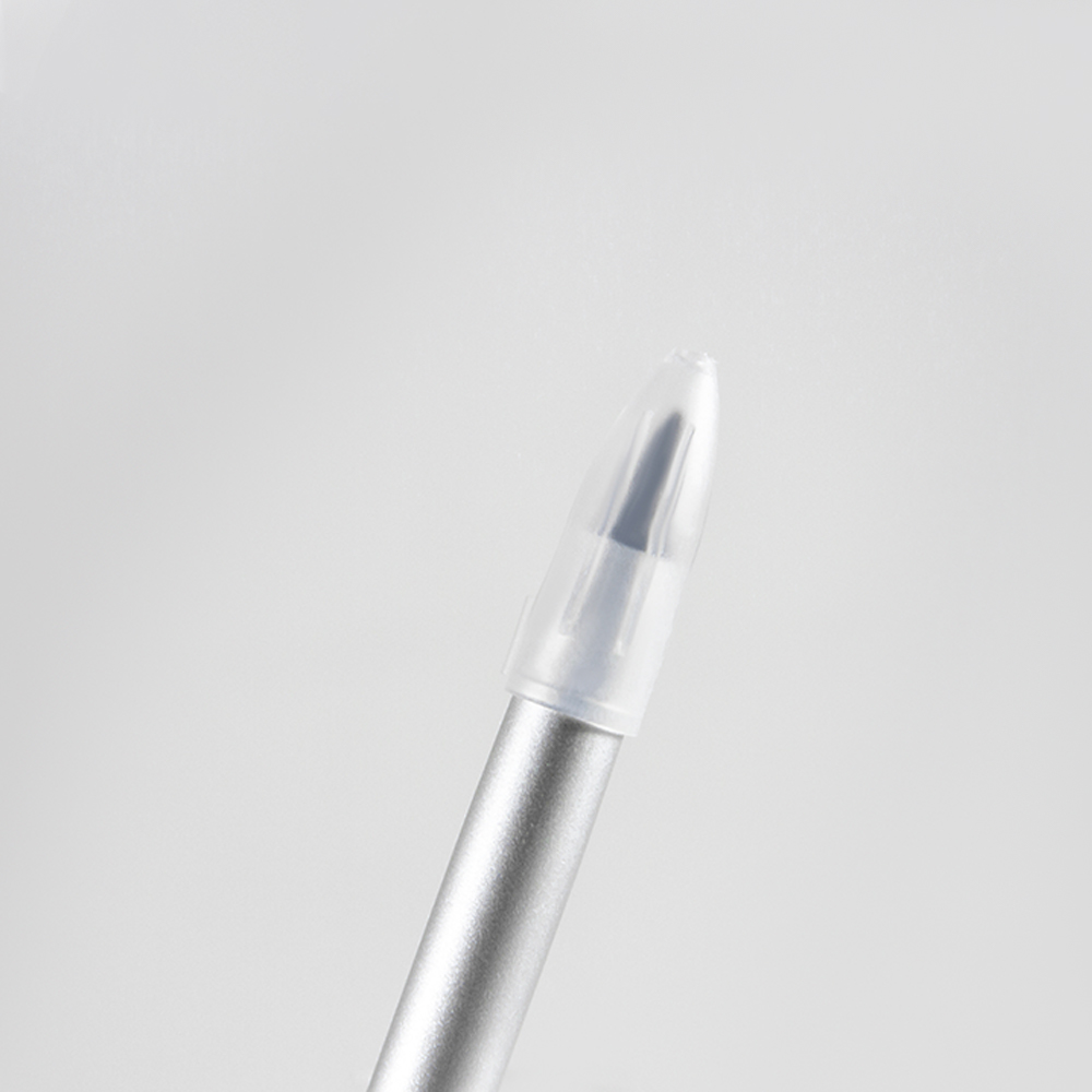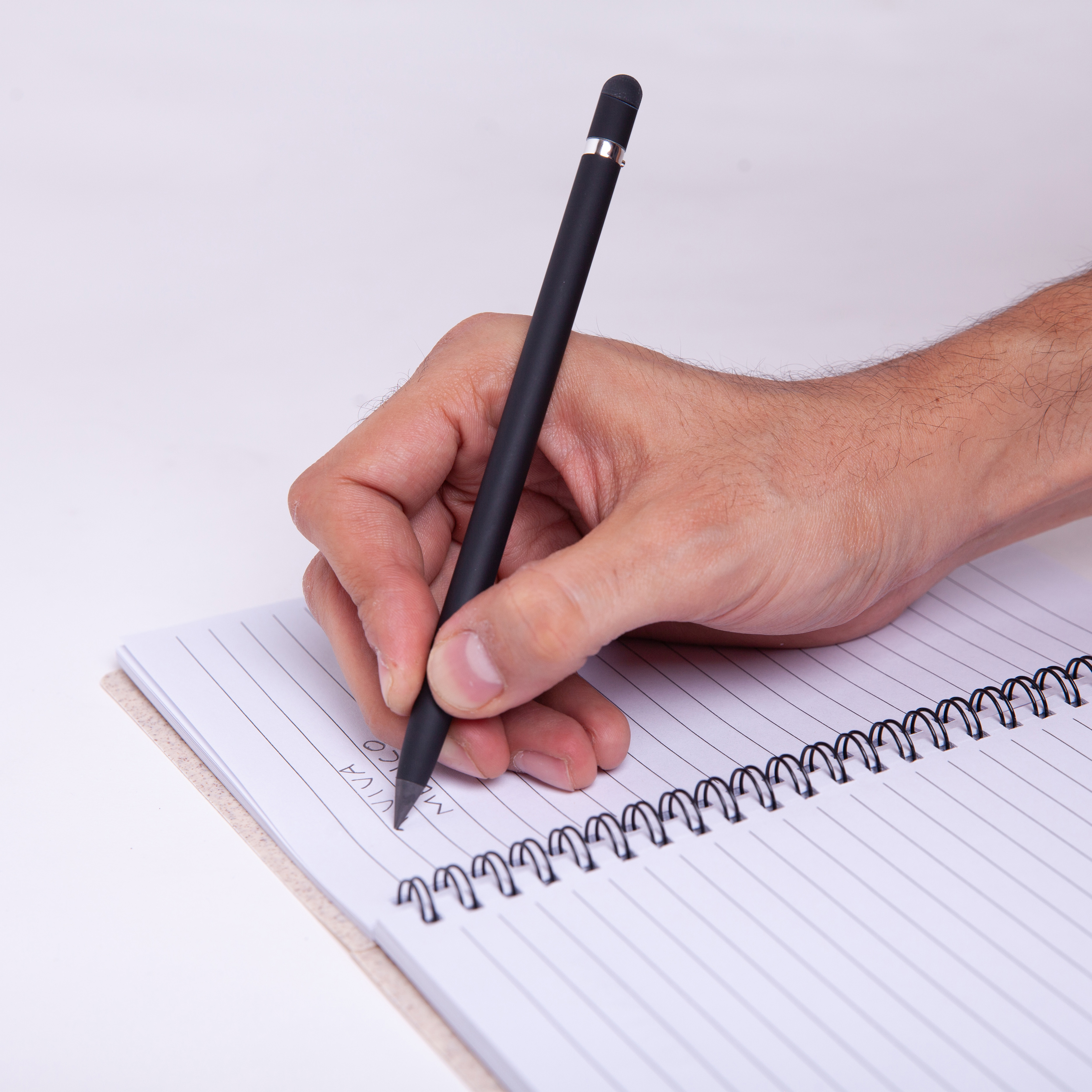 Bolígrafo metálico ecológico con punta de escritura infinita que simula un lápiz. Cuenta con borrador y función touch.