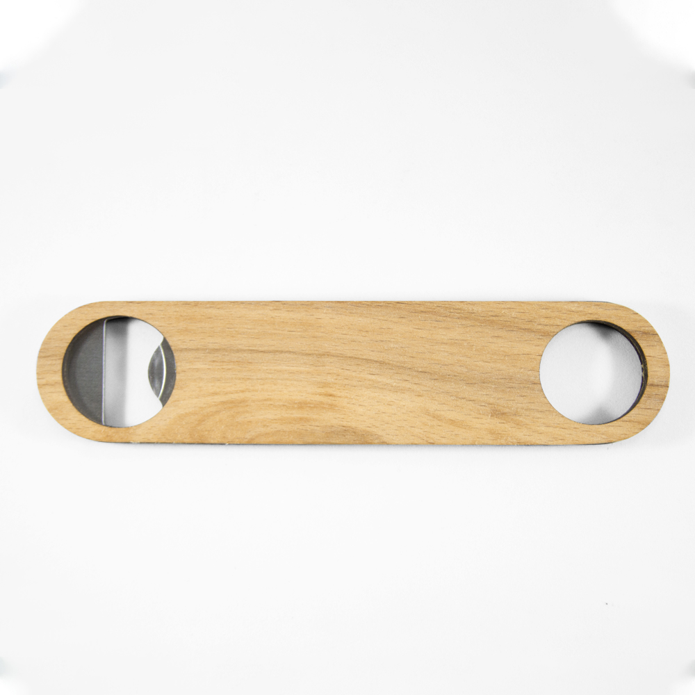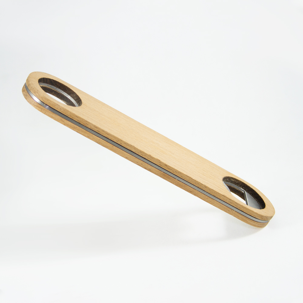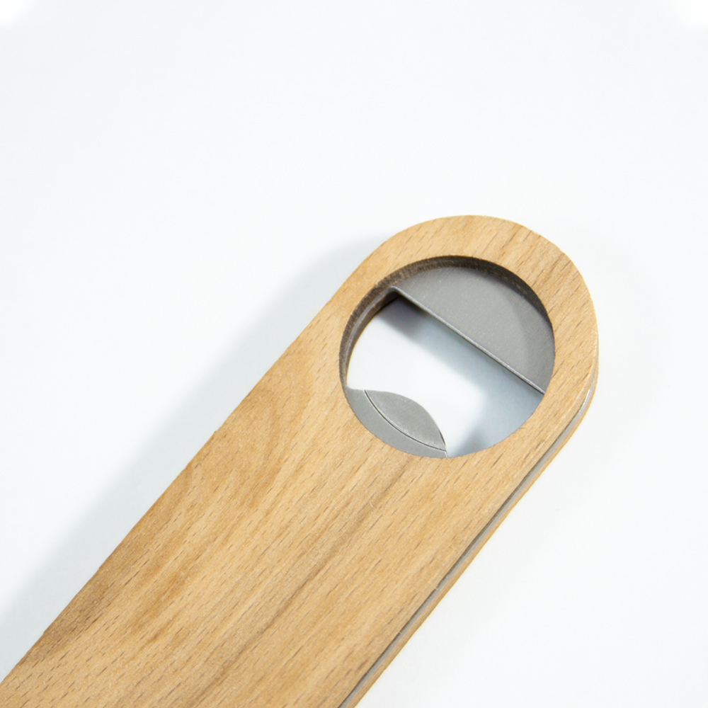 Destapador metálico con colgador/agarradera y cubierta de madera