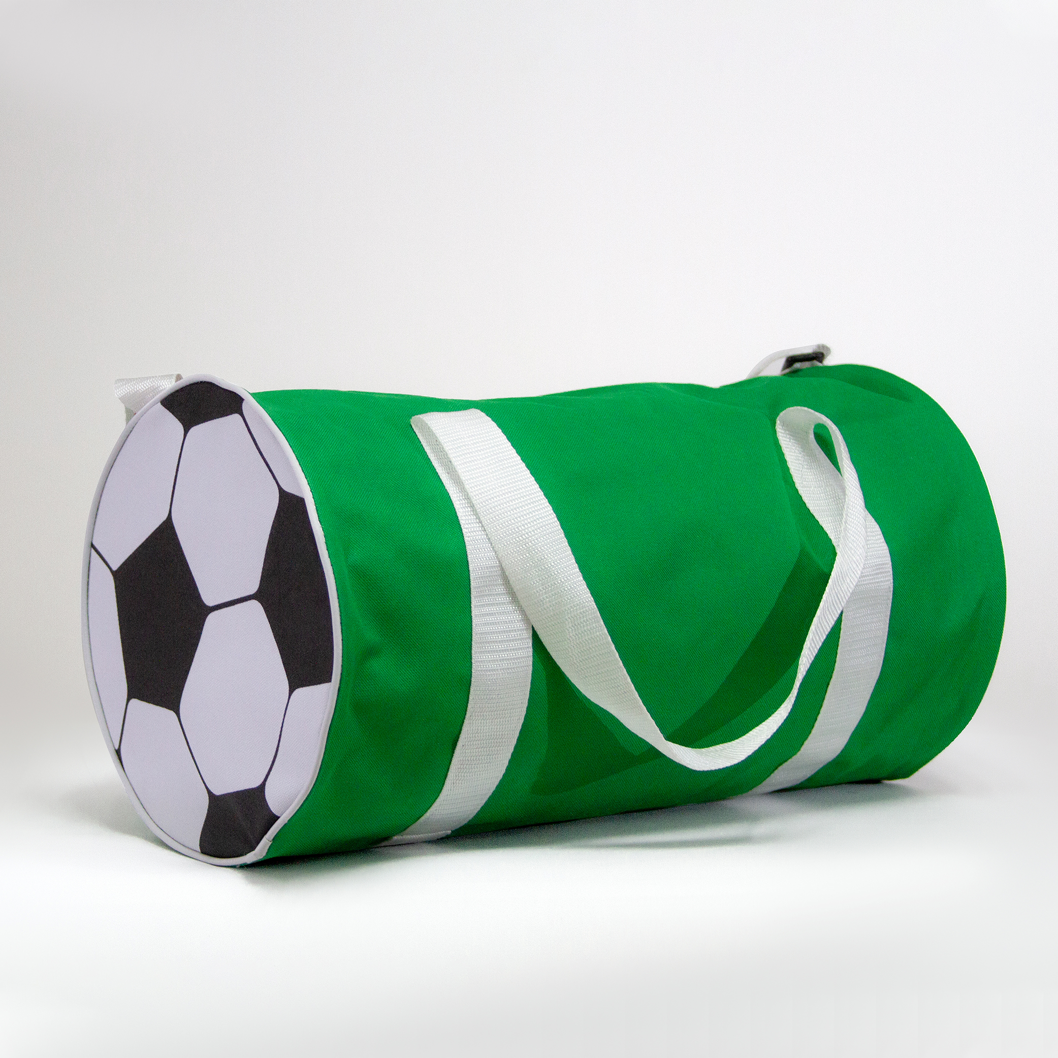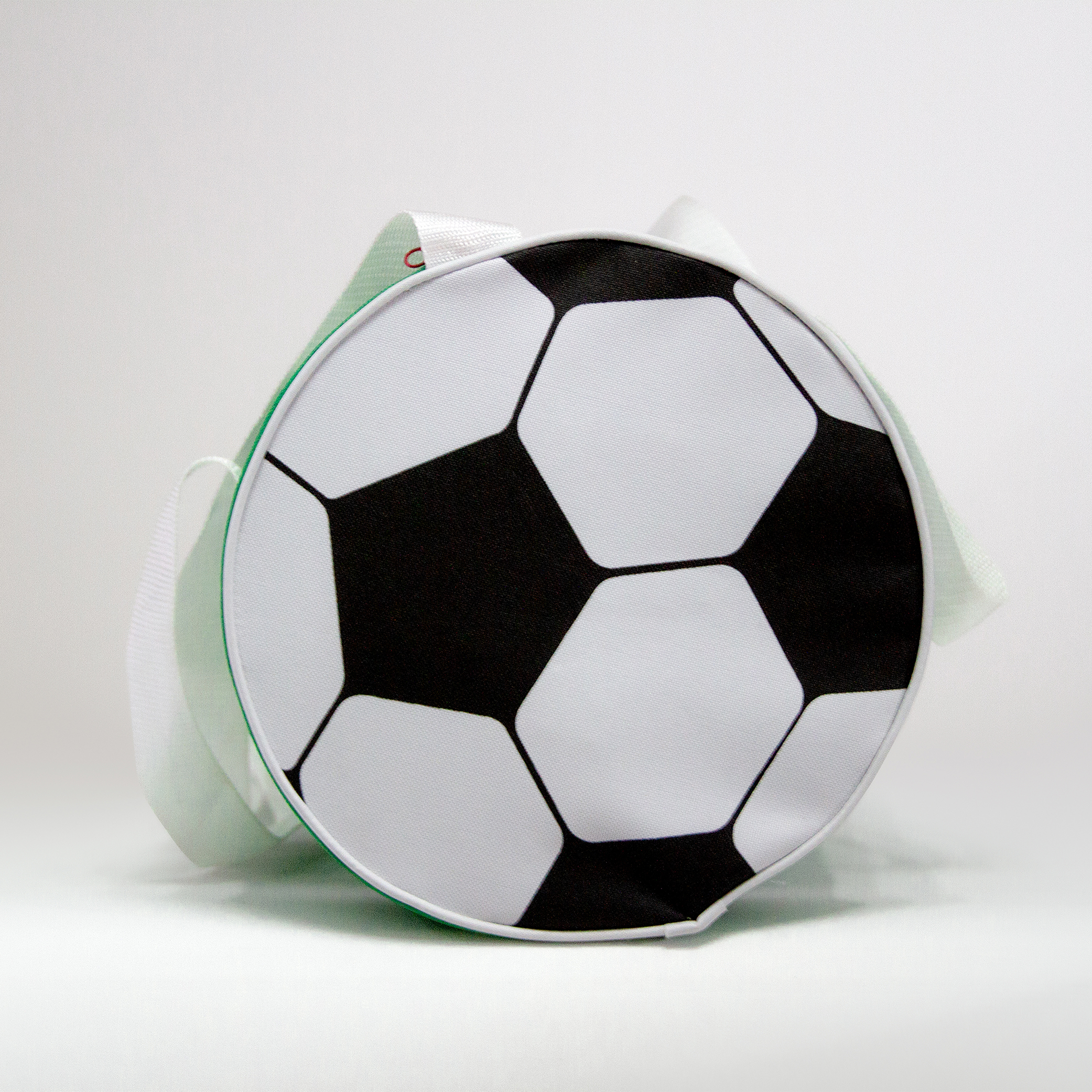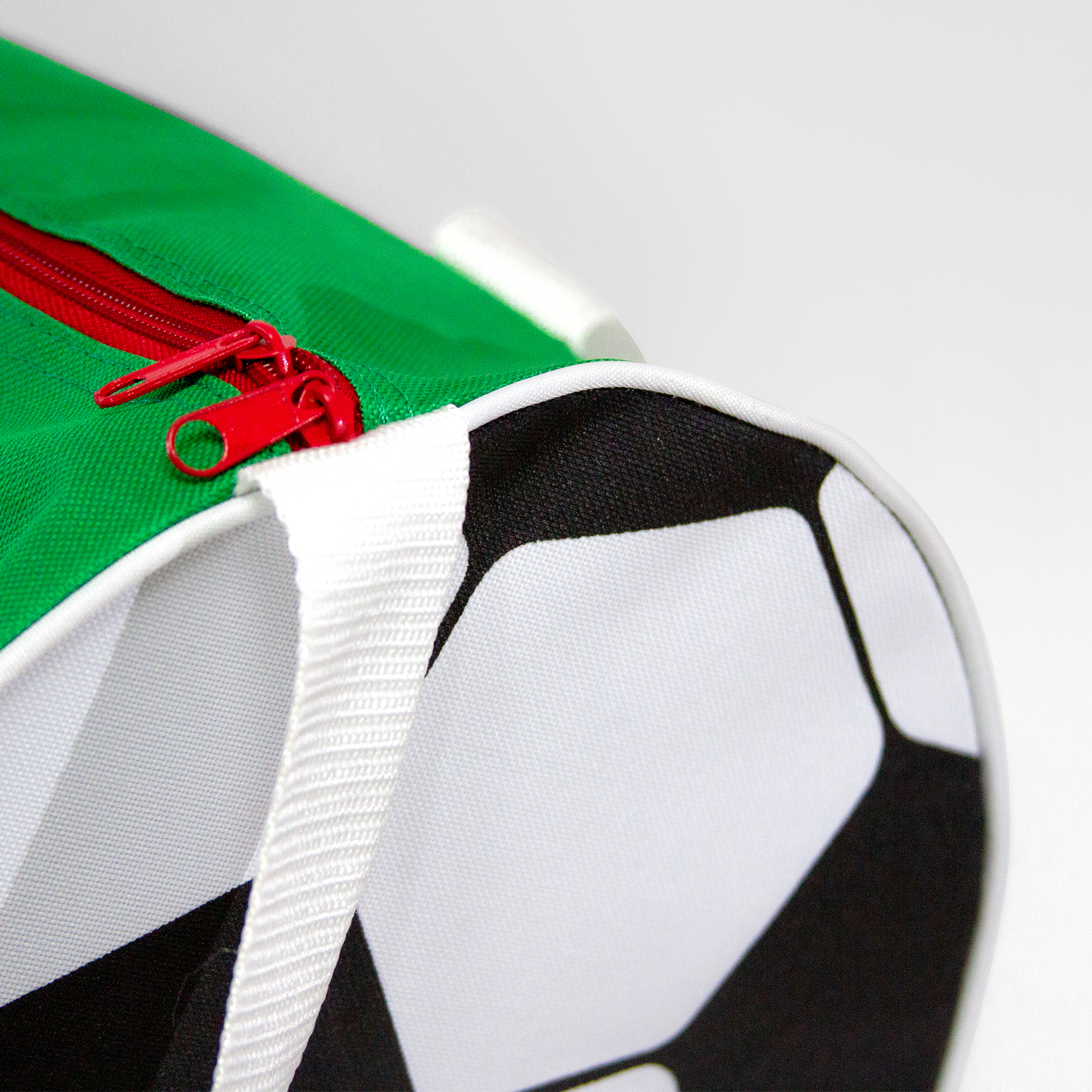 Maleta tricolor de poliéster, con laterales estampados en forma de balón. Correa ajustable y asas de sujeción.