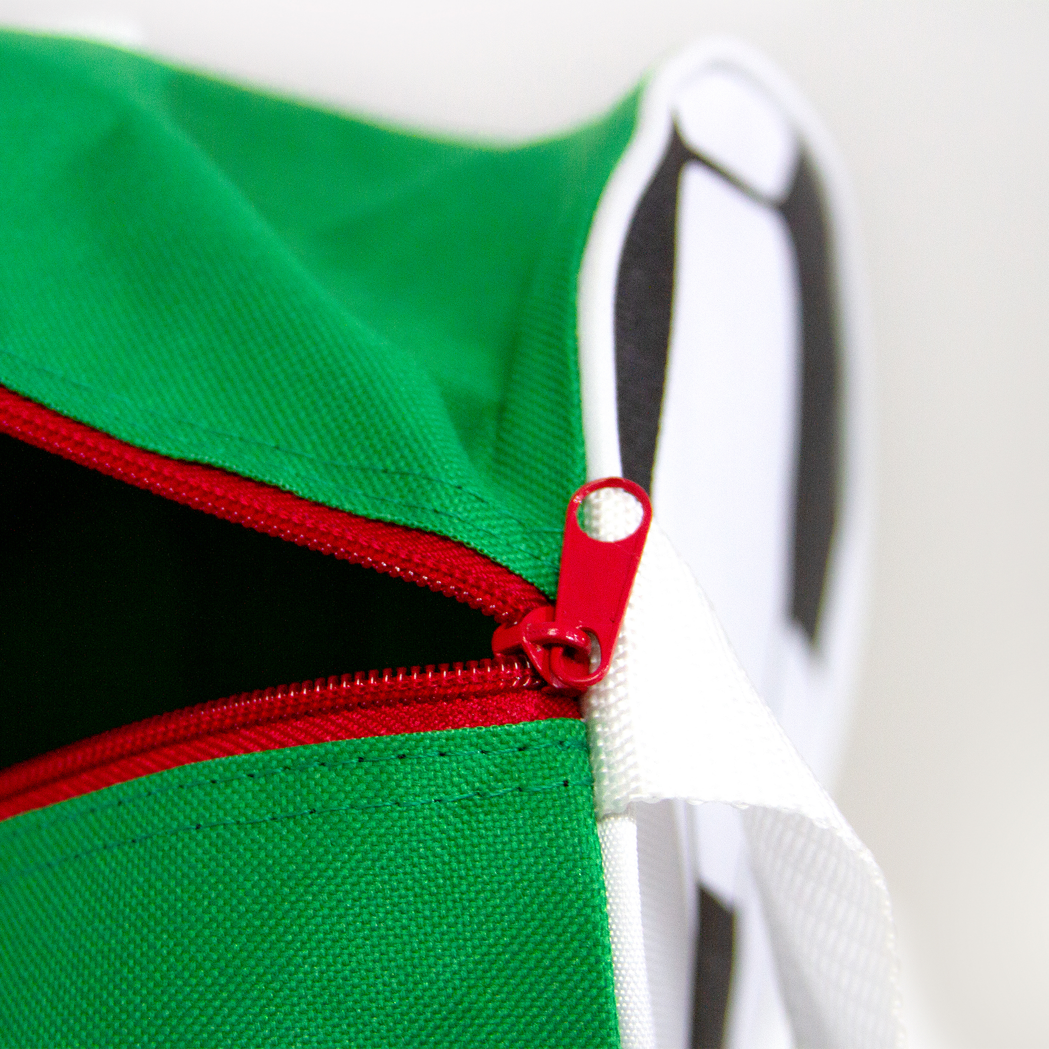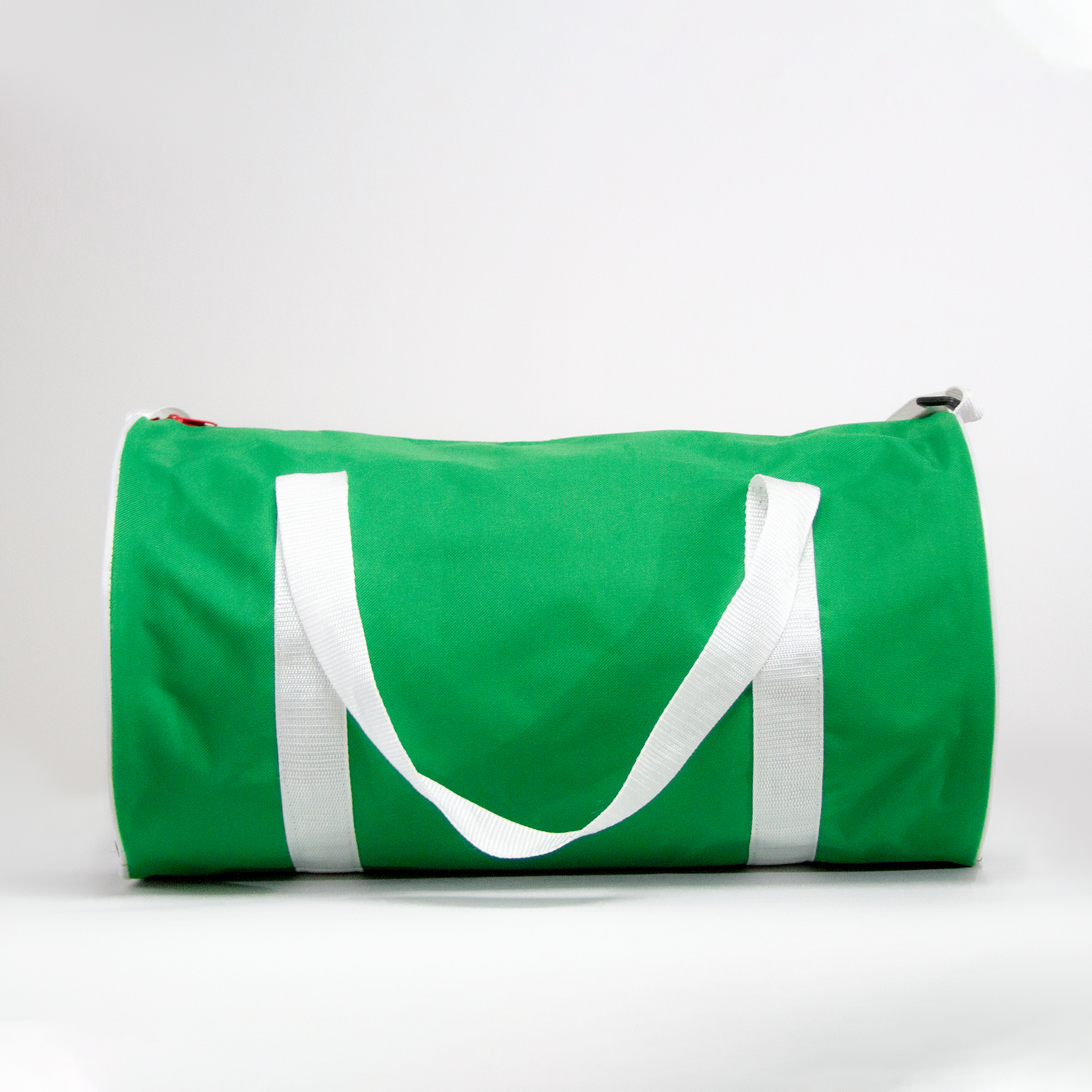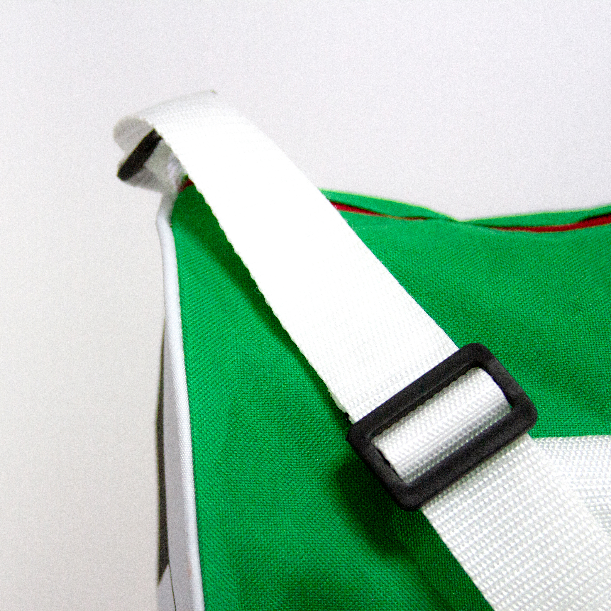 Maleta tricolor de poliéster, con laterales estampados en forma de balón. Correa ajustable y asas de sujeción.