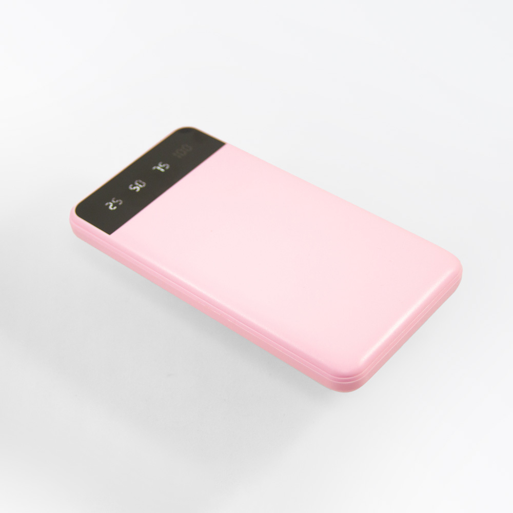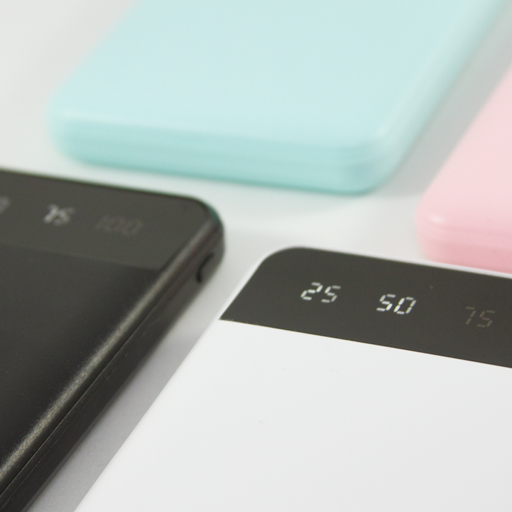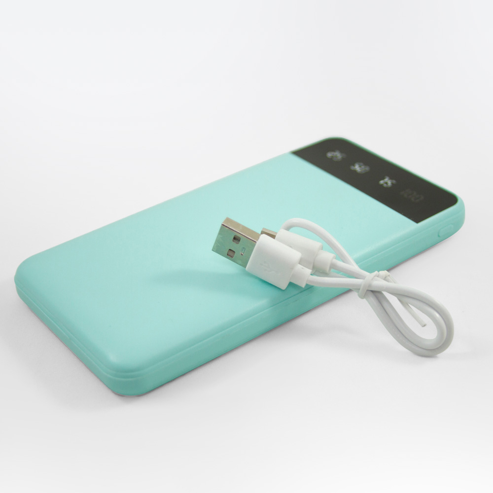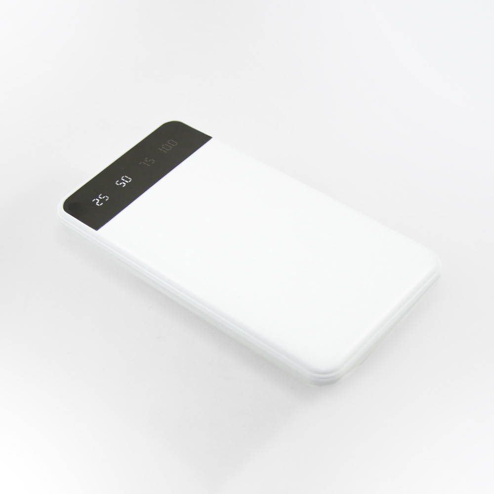 Power bank portátil de plástico con capacidad de 10,000 mAh. Con dos conexiones USB y una conexión micro USB. Incluye pantalla LCD que indica el porcentaje de carga y cable micro USB.